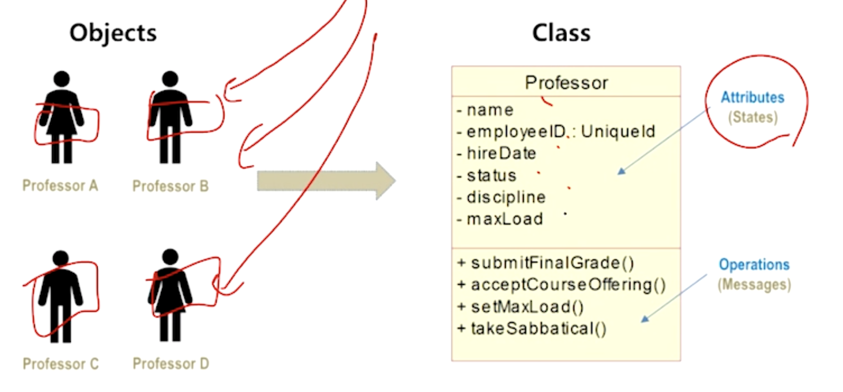 - formal : 유니크한 ID가 있고 다른 것과 구별되는 boundary가 있고 내부에 attribute와 operations을(꼭 둘 다 가지고 있어야함) 가지고 있는 개체 (An object is an entity with a well-defined boundary and identity that encapsulates state and behavior)