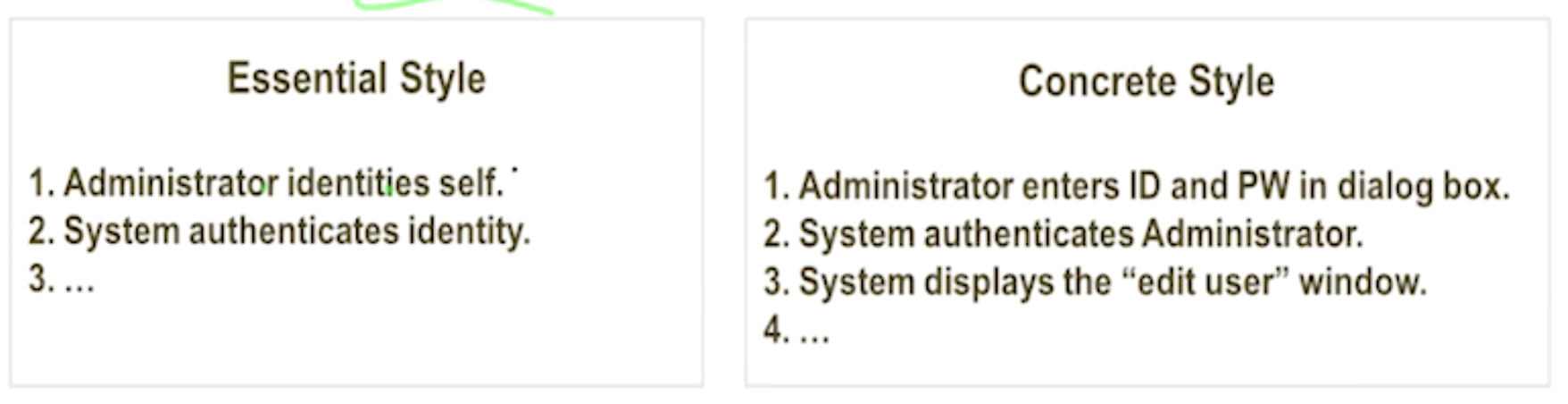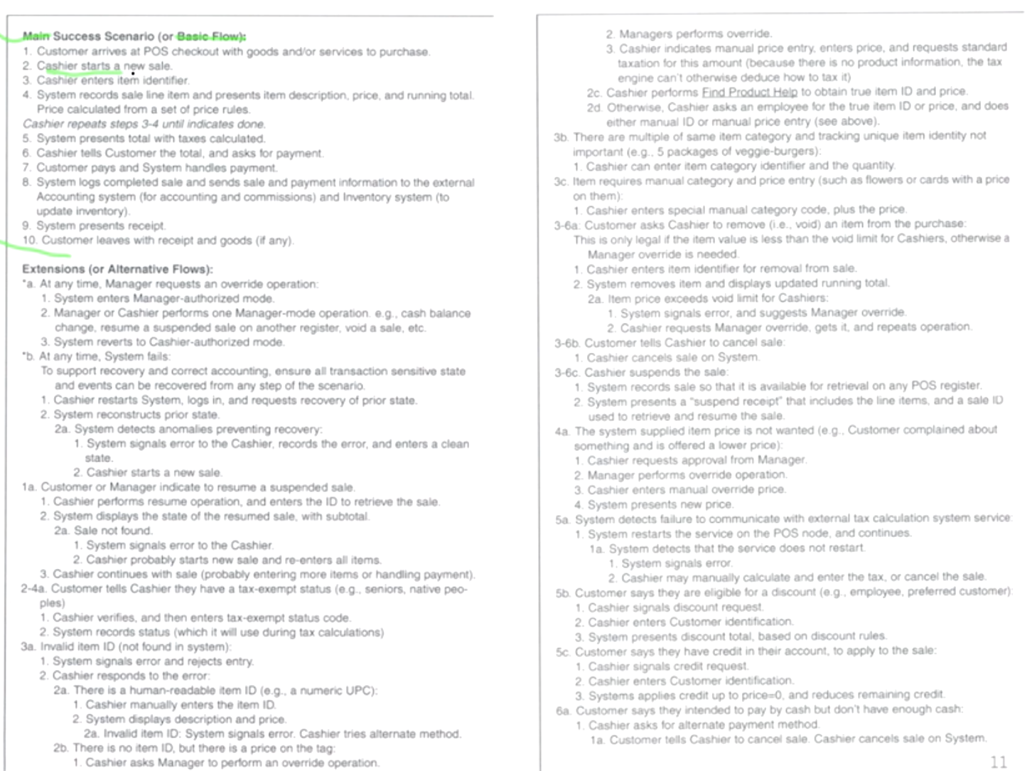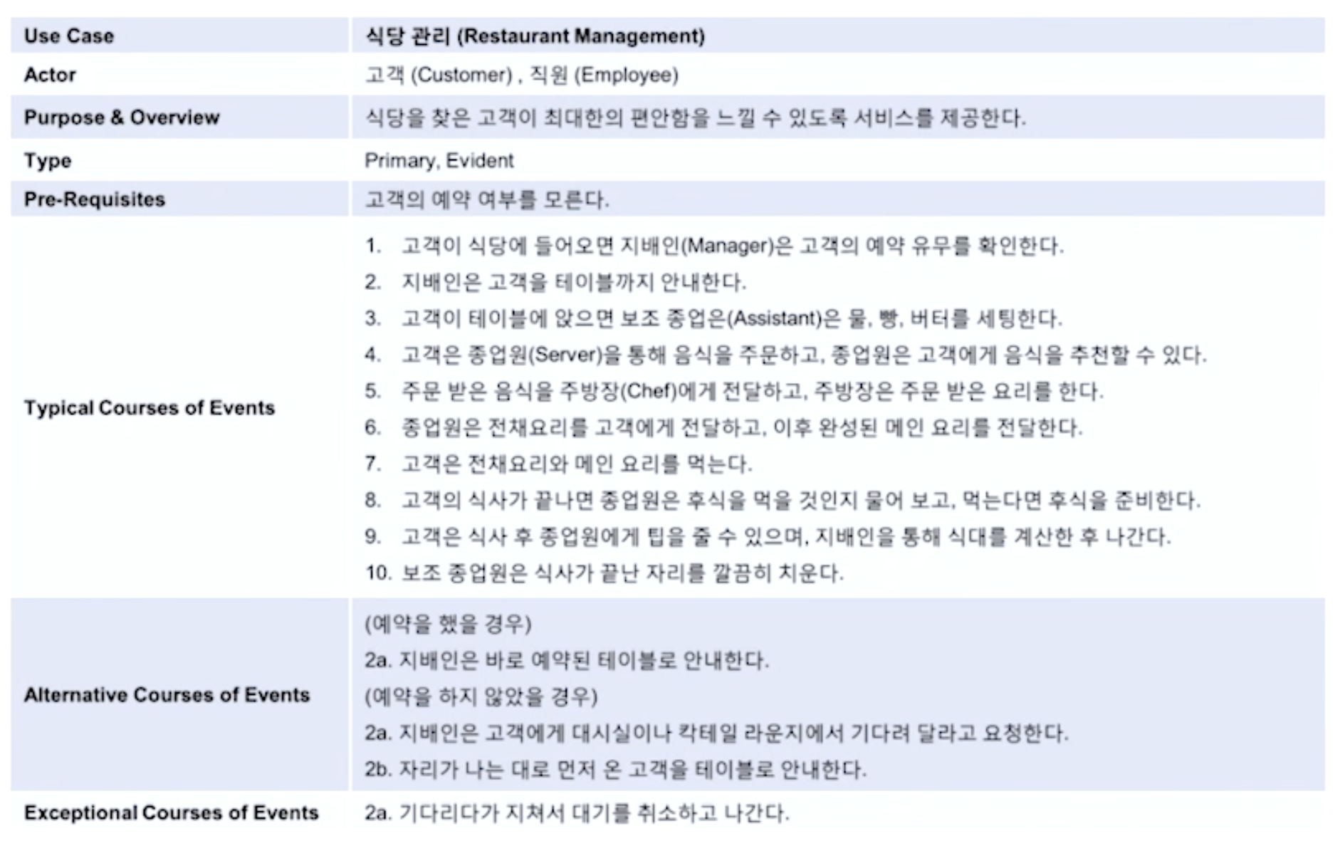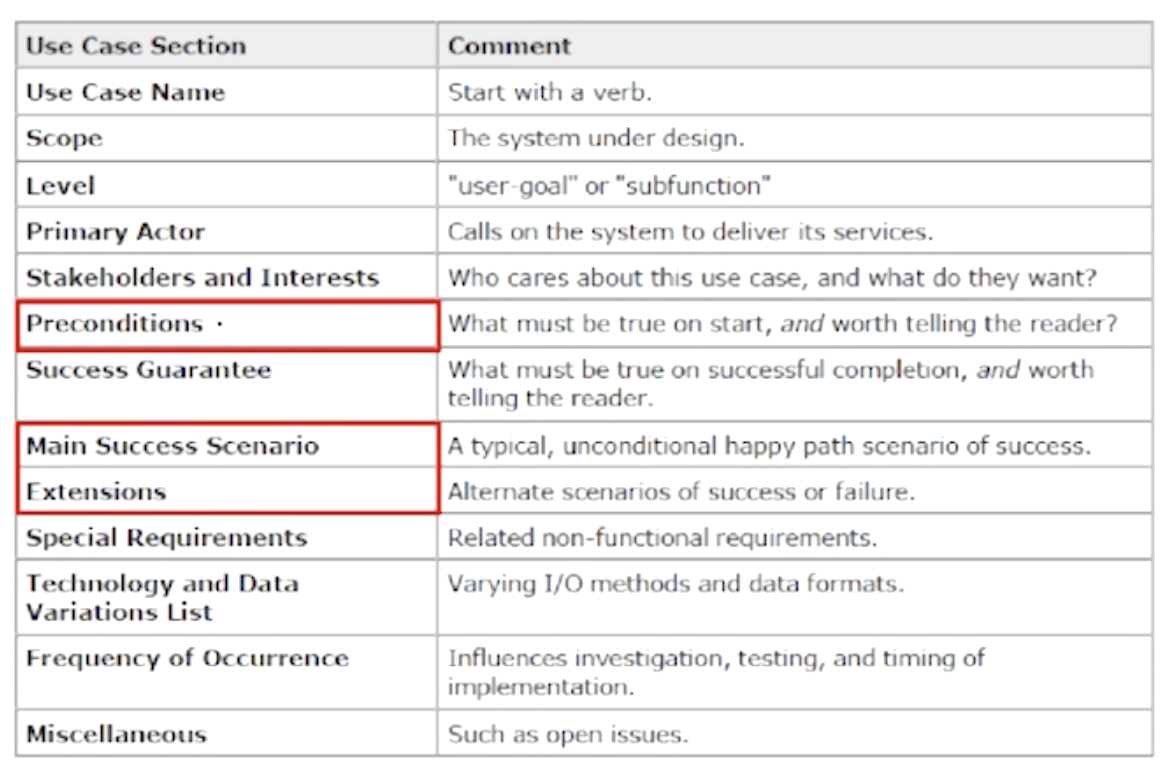 - Main Success(가장 많이 발생. 큰 길), Alternate(자주 발생하지 않지만 목표가 동일. 샛 길) 시나리오 나눠서 작성