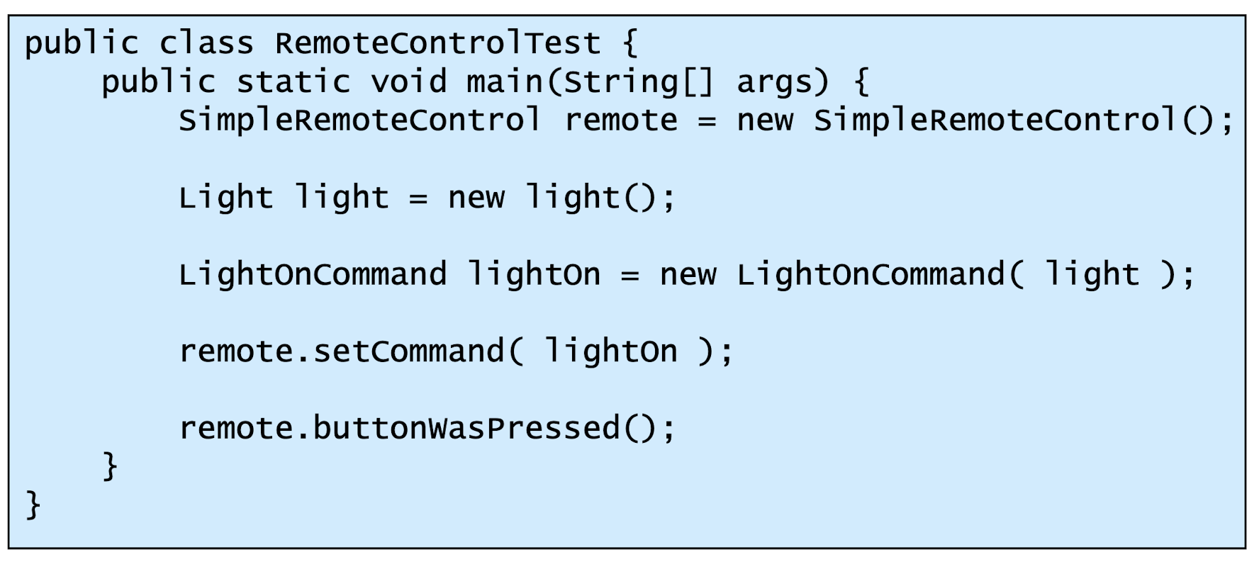 - ConcreteCommand : 실행되는 Command을 구현하는 클래스. Receiver가 무엇을 처리해야하는지 정의