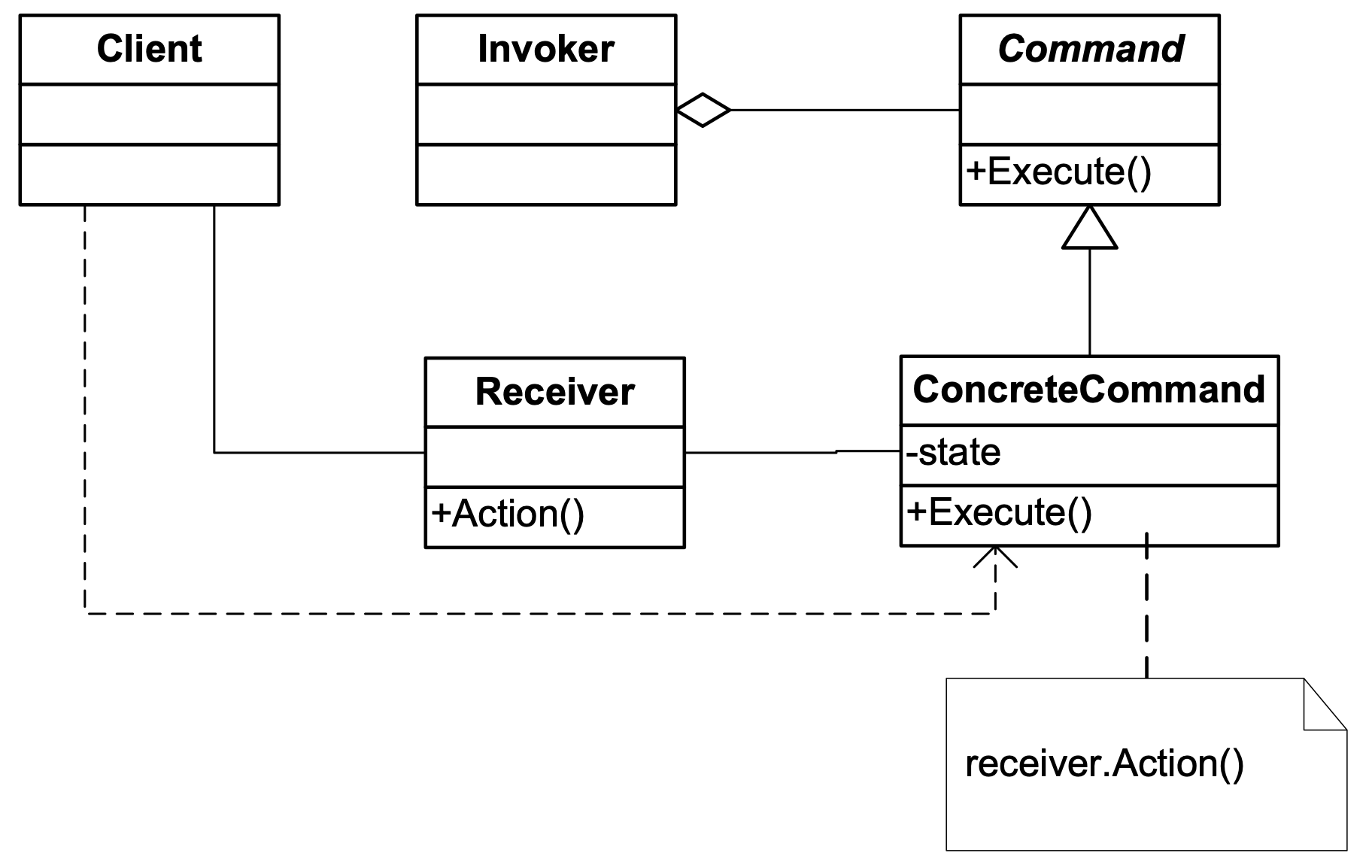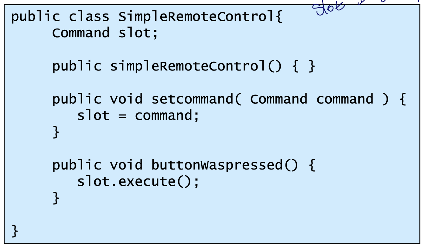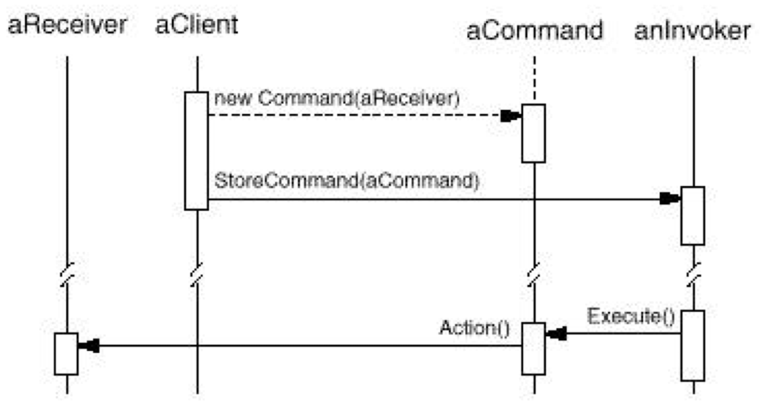 - Receiver : ConcreteCommand에서 execute()를 구현할 때 필요한 클래스. ConcreteCommand의 기능을 실행하기 위해 사용하는 수신자 클래스. Client가 요청한 내용에 대해 액션만 취해주면 됨