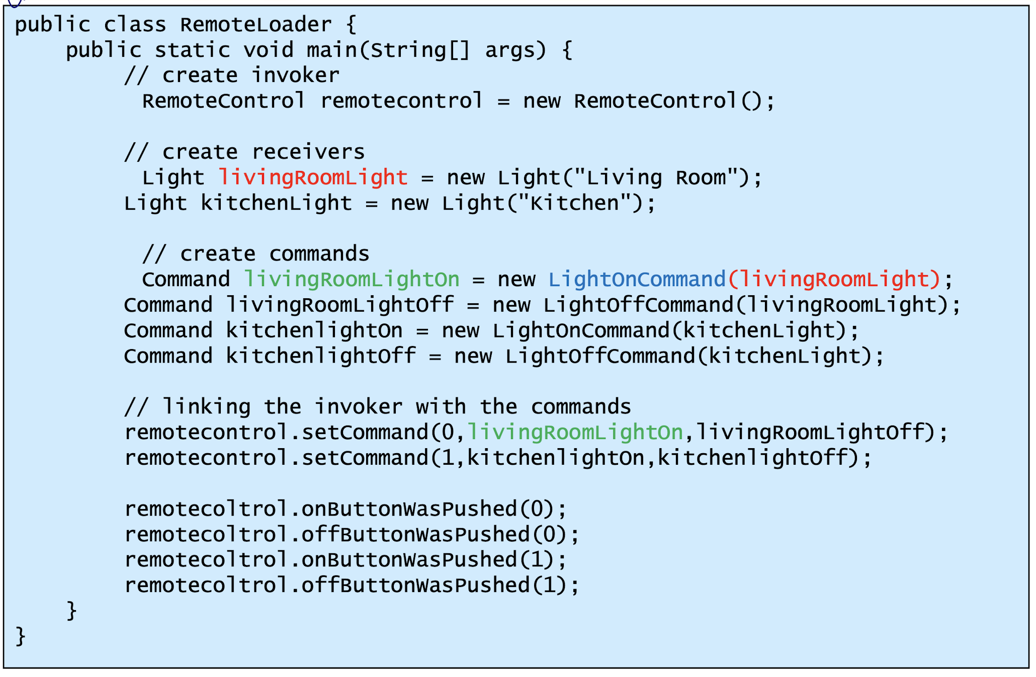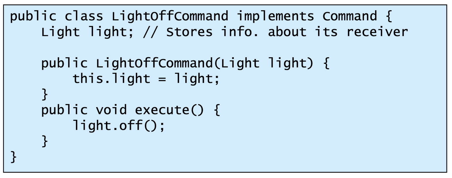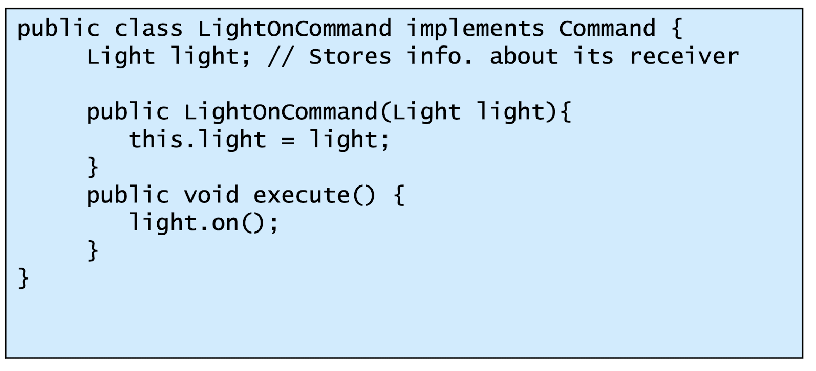 - Receiver : ConcreteCommand에서 execute()를 구현할 때 필요한 클래스. ConcreteCommand의 기능을 실행하기 위해 사용하는 수신자 클래스. Client가 요청한 내용에 대해 액션만 취해주면 됨