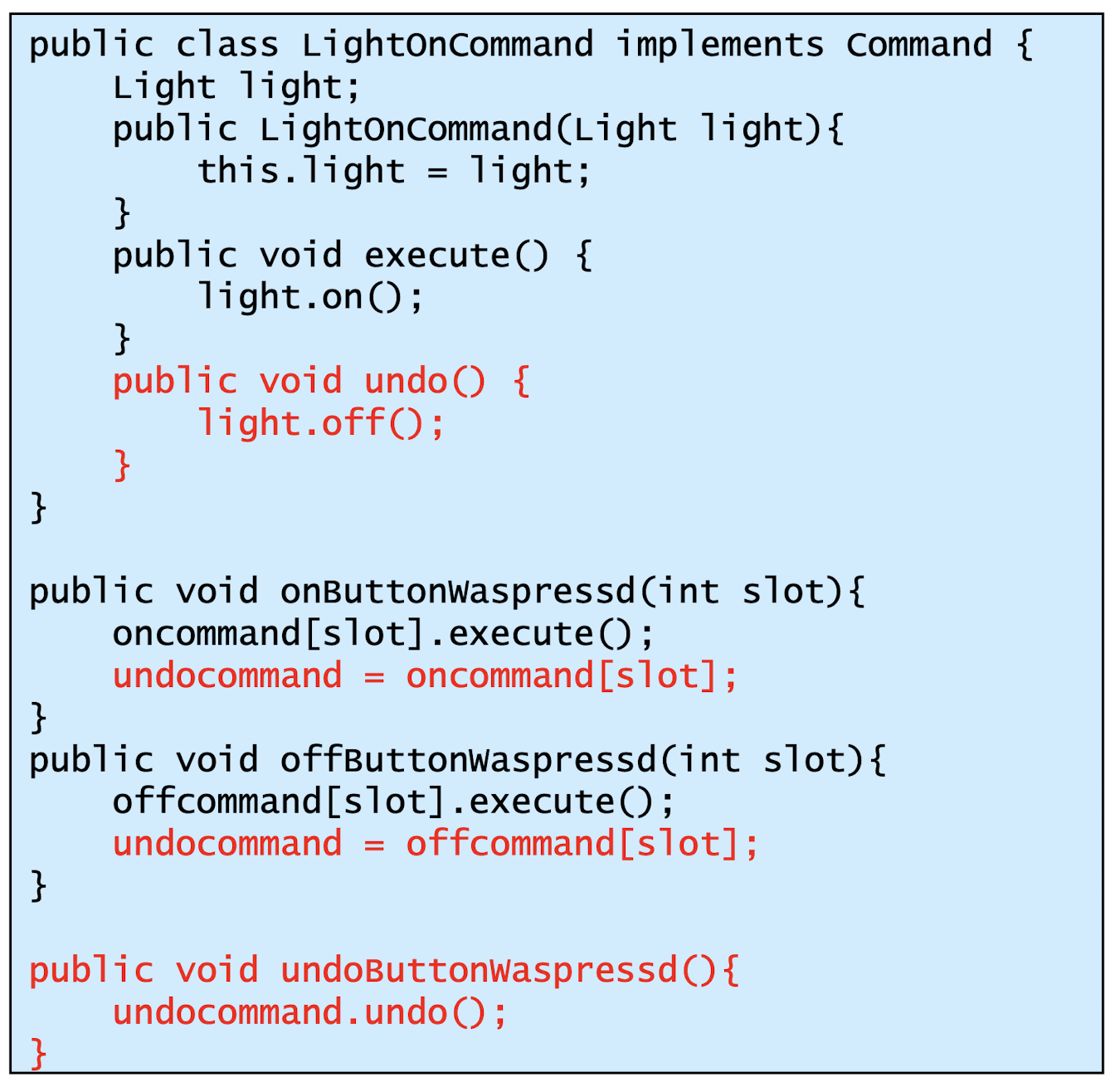 - Receiver : ConcreteCommand에서 execute()를 구현할 때 필요한 클래스. ConcreteCommand의 기능을 실행하기 위해 사용하는 수신자 클래스. Client가 요청한 내용에 대해 액션만 취해주면 됨
