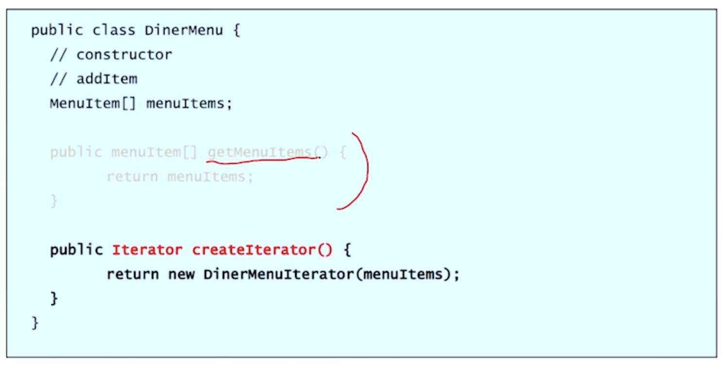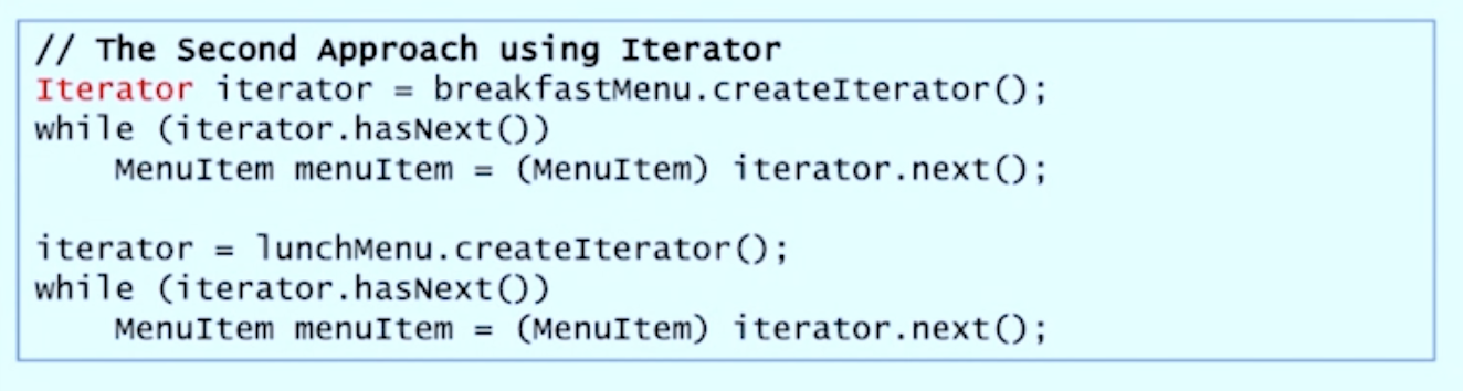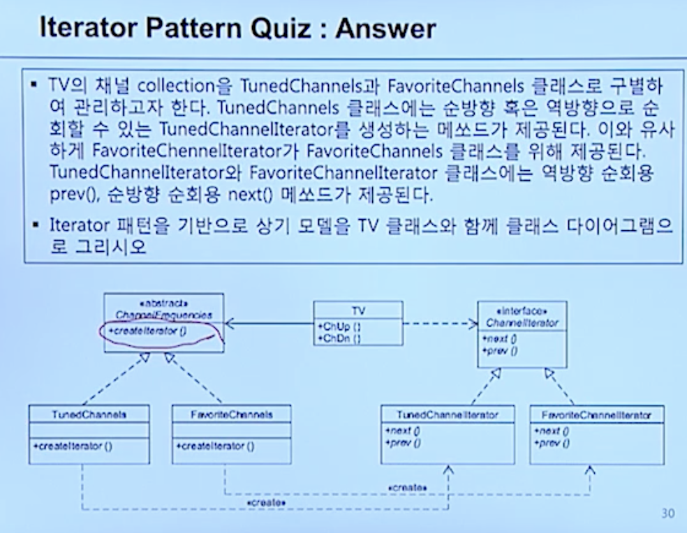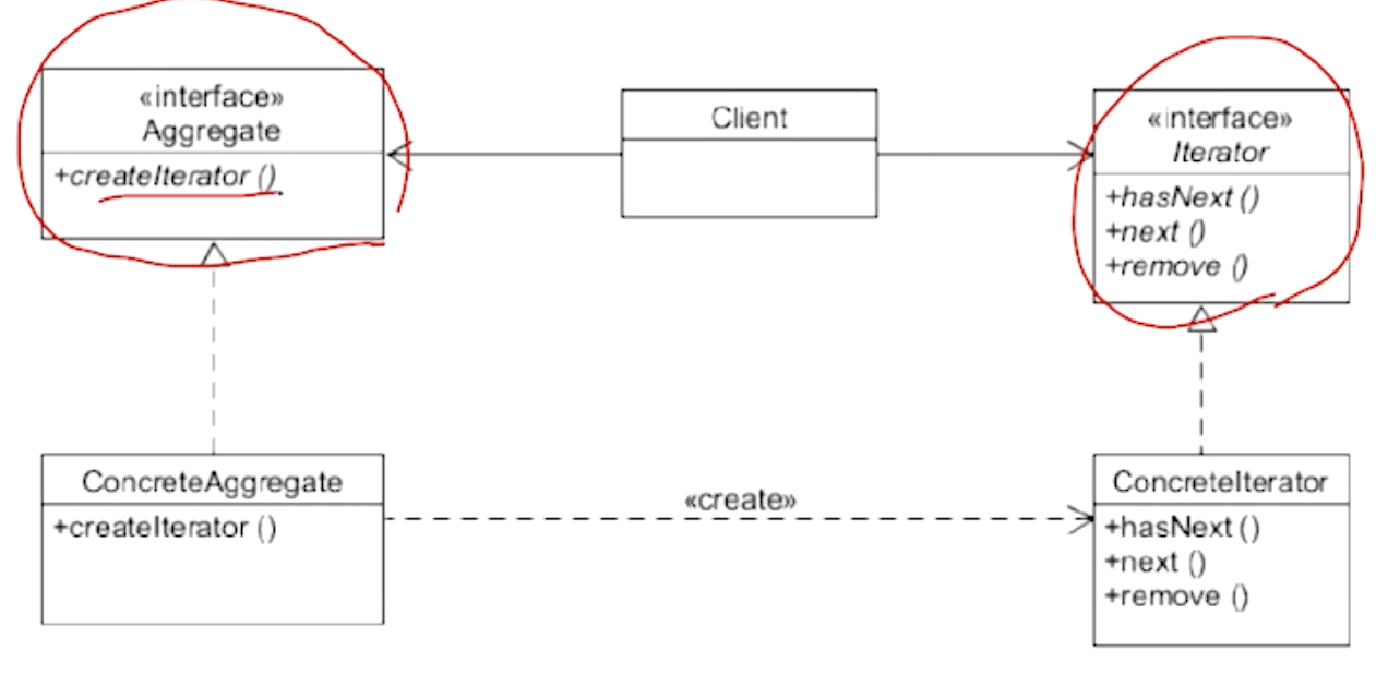 aggregate object의 구조를 노출시키지 않으면서 각각의 element를 접근할 수 있는 패턴