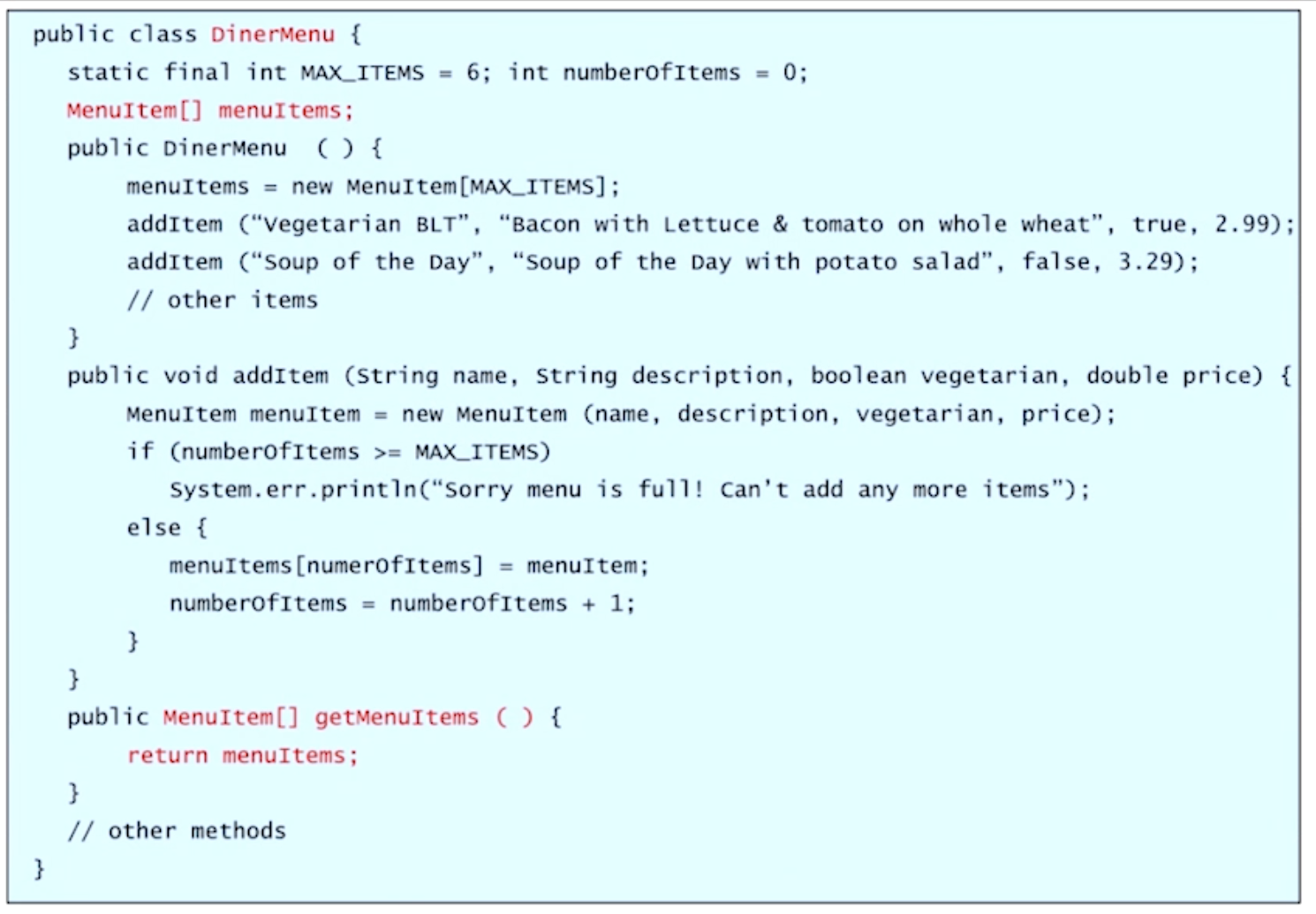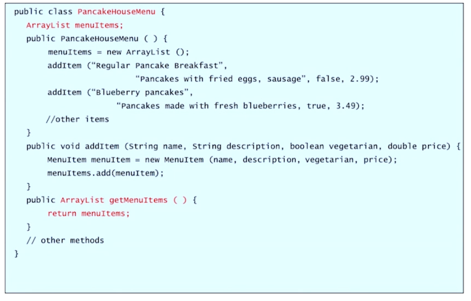 첫 번째 레스토랑은 ArrayList에 메뉴를 넣어주고 있는 형식이다.