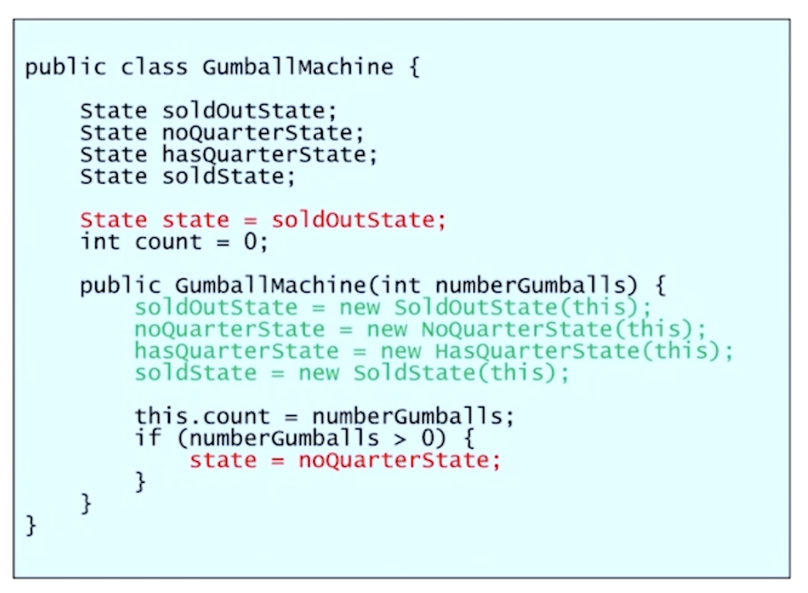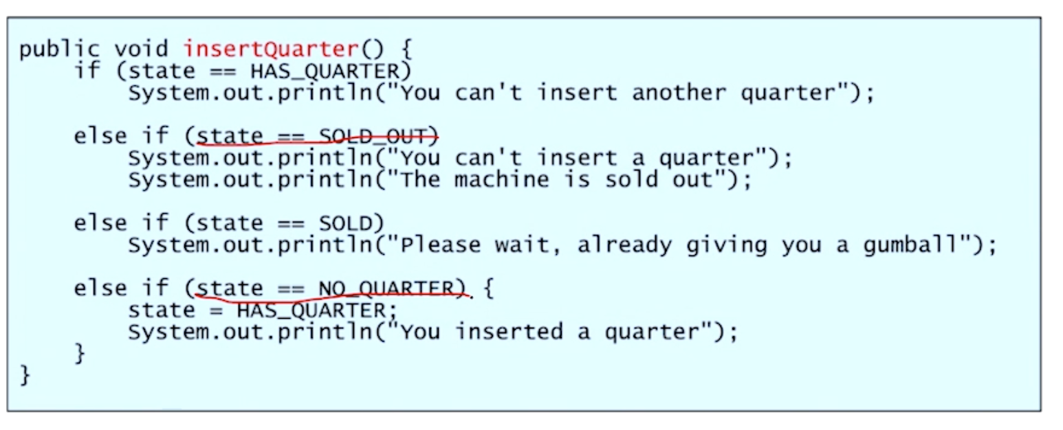 이벤트 함수인 insertQuarter(), ejectQuarter()에서는 현재 상태에 따라 다르게 반응해야하기 때문에