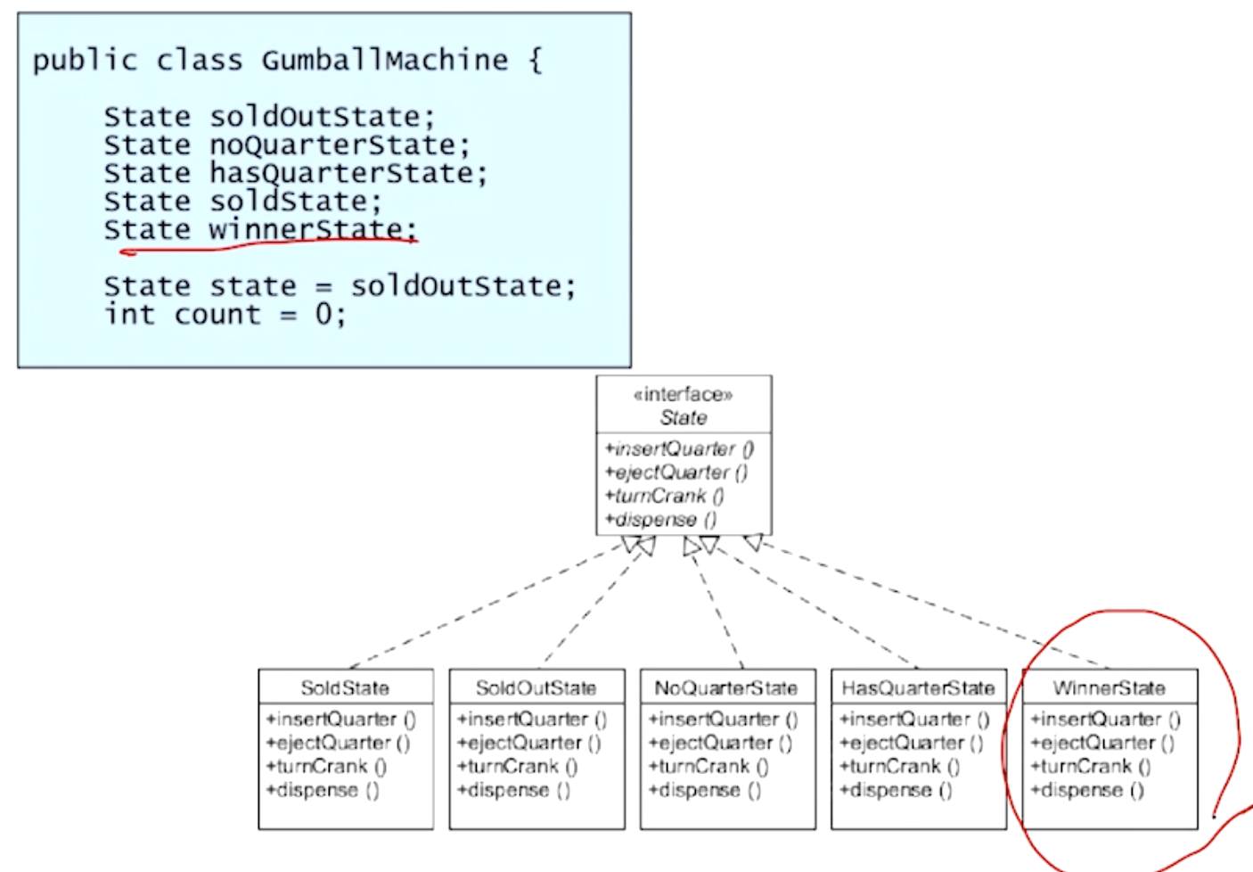 state interface를 정의해서 gumball 기계에서 일어날 수 있는 method를 넣는다.