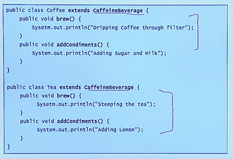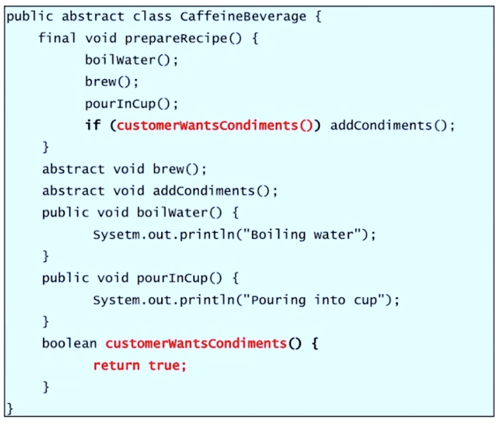 prepareRecipe()는 알고리즘의 템플릿 역할을 하여 template method patten을 구현하고 있다.