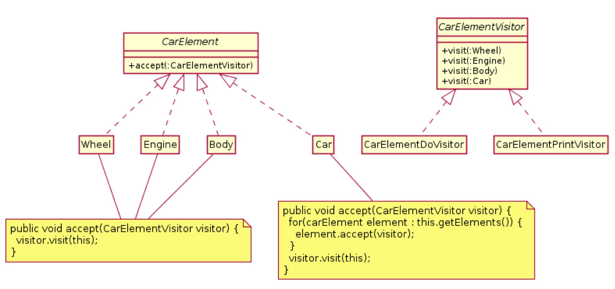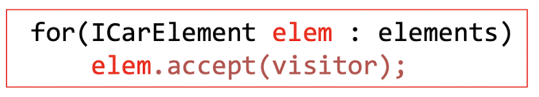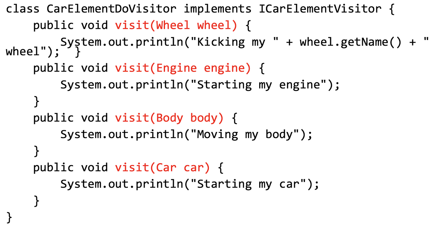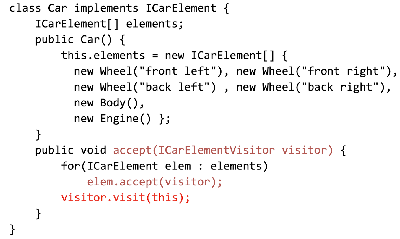 - Object Structure : element의 집합 (ex. 아래의 car class). visitor가 각 element를 방문하는데 high-level interface 제공
