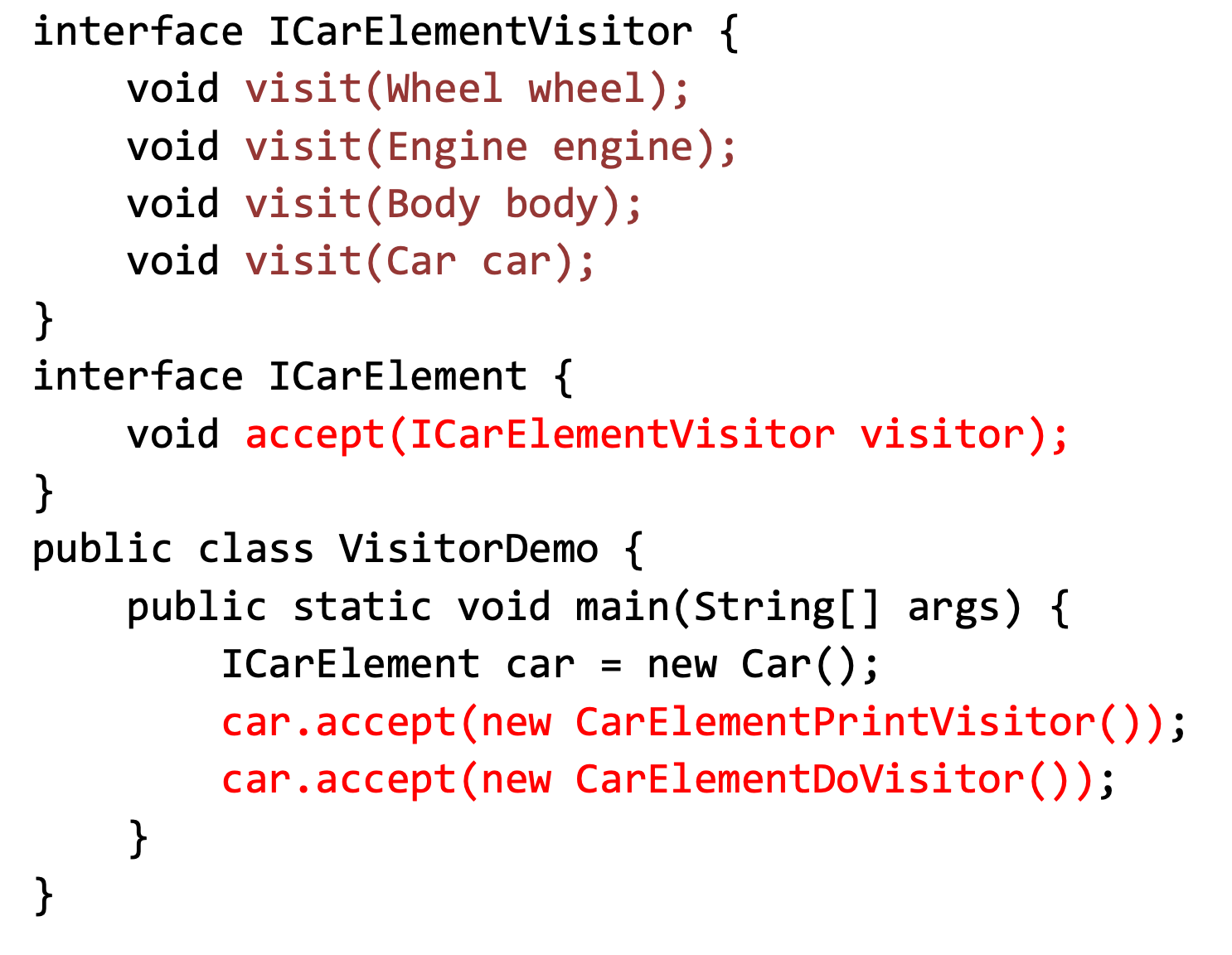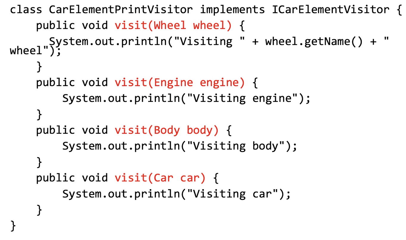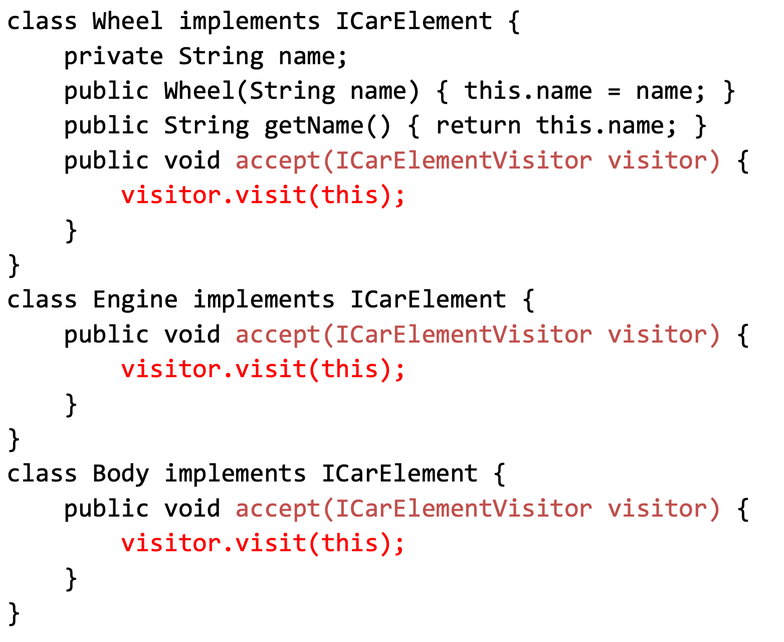 - Object Structure : element의 집합 (ex. 아래의 car class). visitor가 각 element를 방문하는데 high-level interface 제공