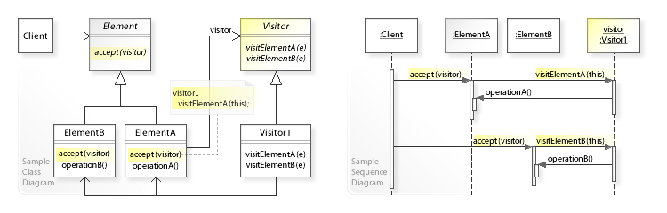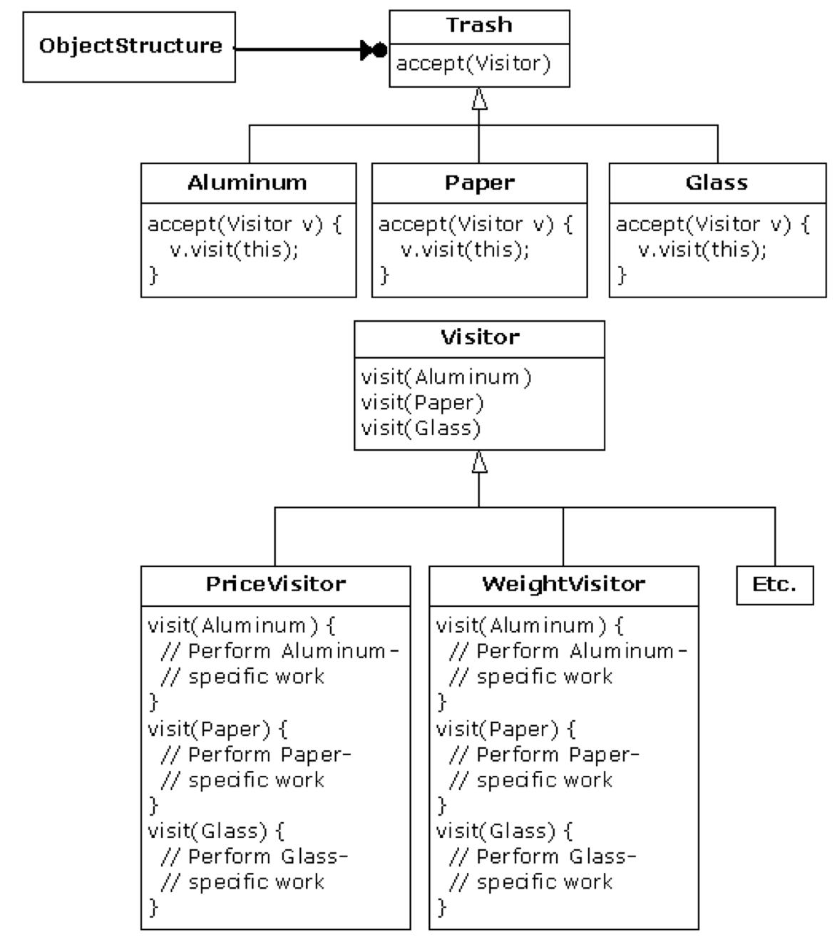 - Client : ConcreteVisitor object를 생성하고, object 집합을 각 visitor와 함께 방문
