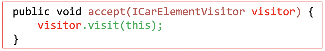 이를 통해 accept method는 visitor에게 함수 실행 로직을 위힘하여 실제로 기존 코드 변경 없이 accept에 대한 구현을 동적으로 변경할 수 있음