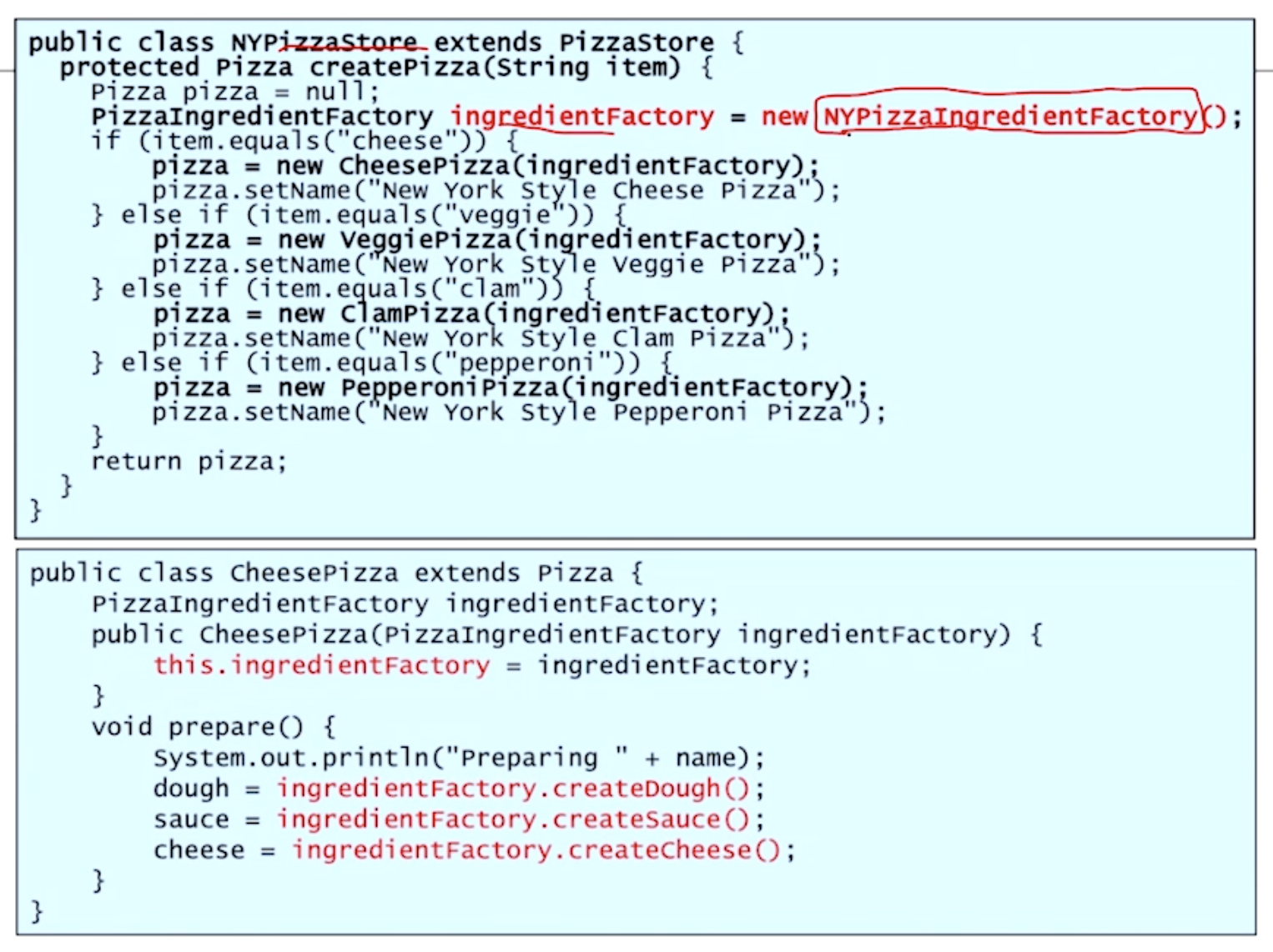 피자를 생성하면서 ingredient 생성부분은 Abstract Factory Method 패턴을 이용해서 생성한다. (4~5)