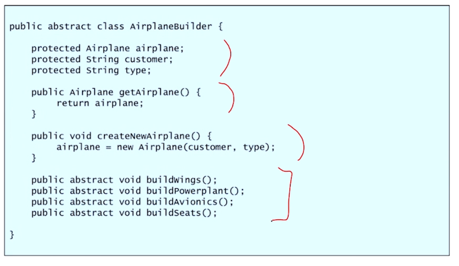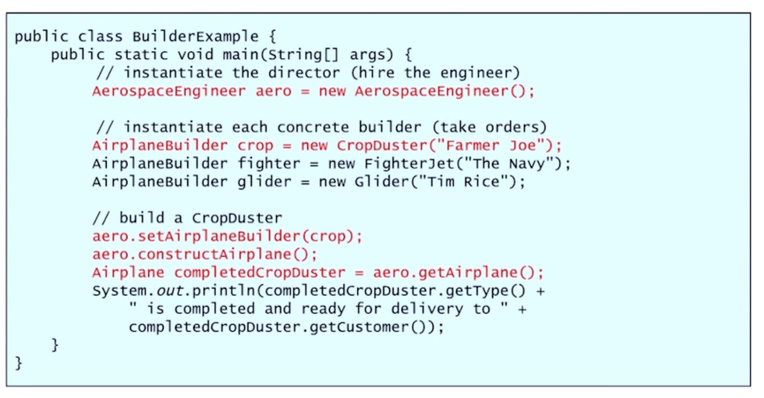 AerospaceEngineer는 Director 역할이고 constructAirplane()을 보면 만들어야하는 Object를 위한 step을 알고있다.