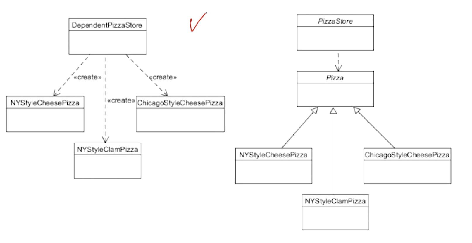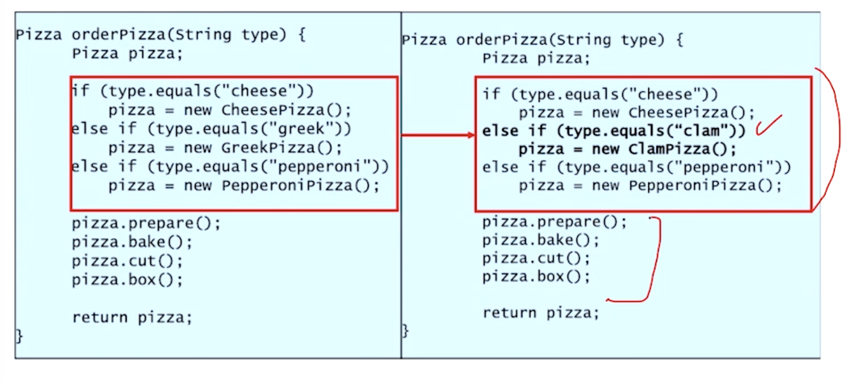 이제 피자 타입이 변경되어도 client코드 내 orderPizza는 변경할 필요가 없다. (dependency가 사라졌다)