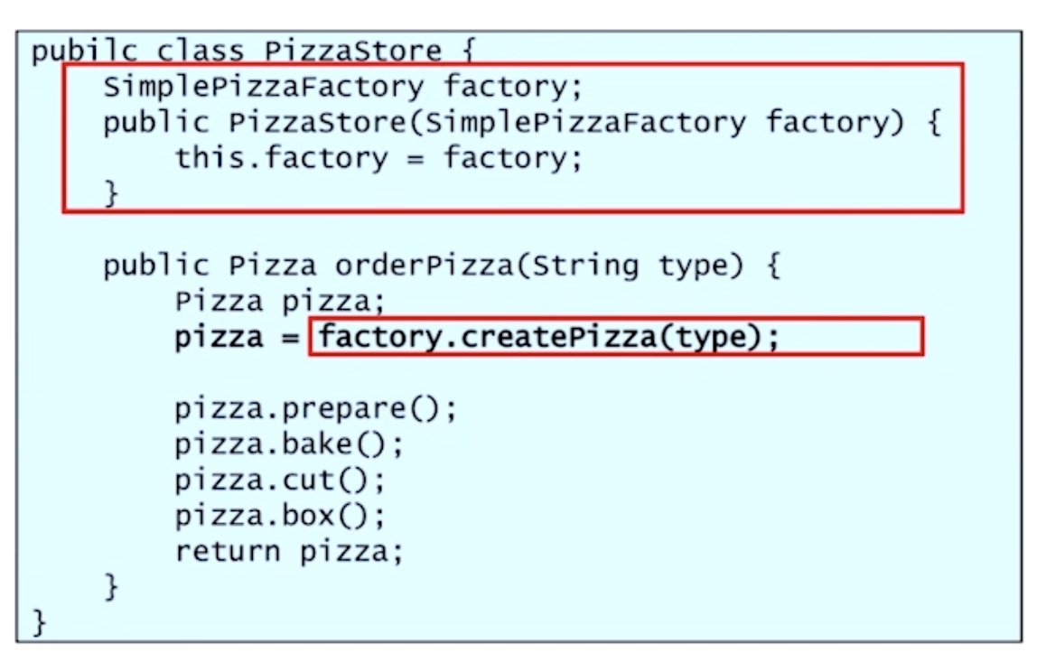 타입에 맞는 피자 생성을 factory에 위임한다.