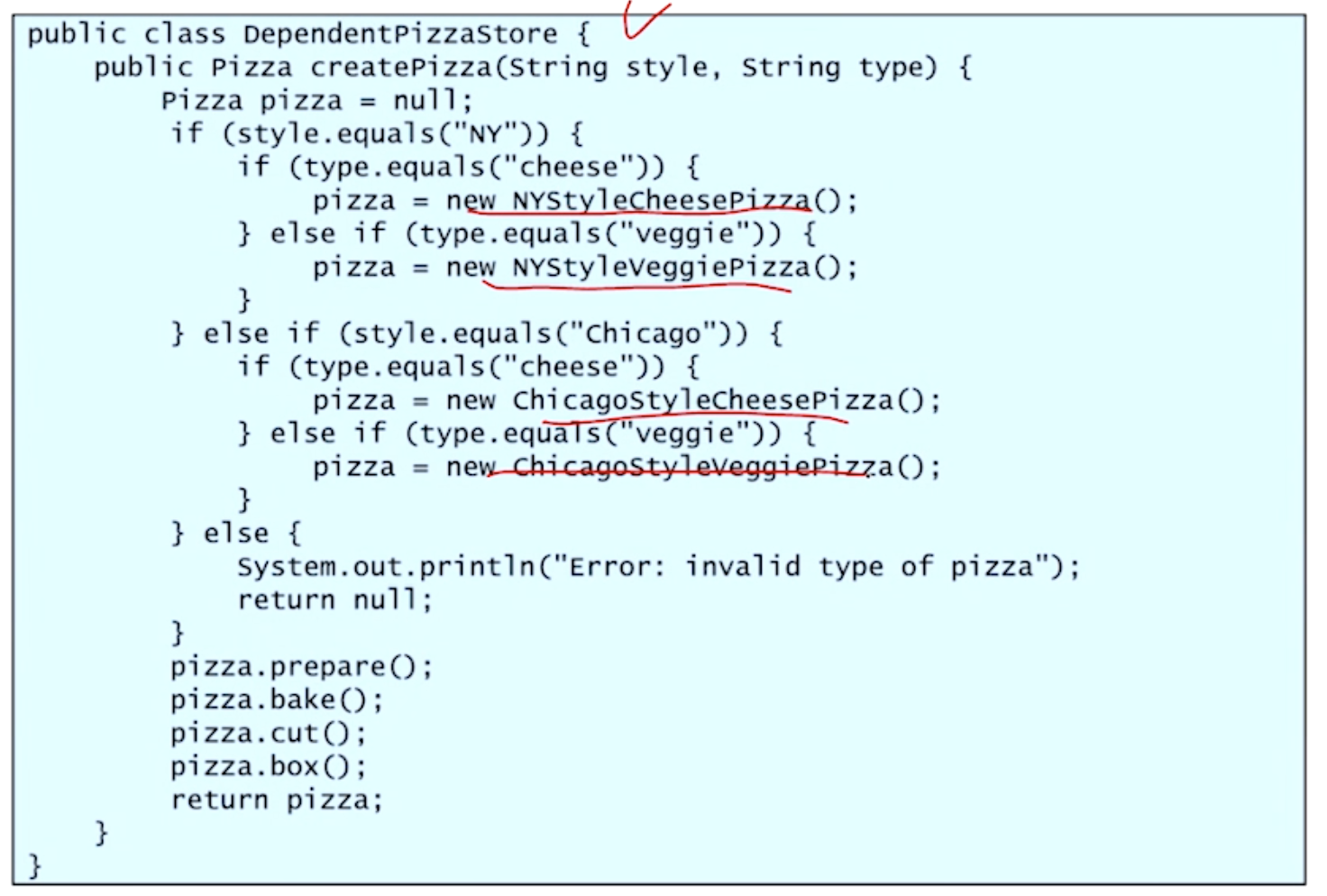 자신이 만들 Pizza를 직접적으로 호출하고 있다.