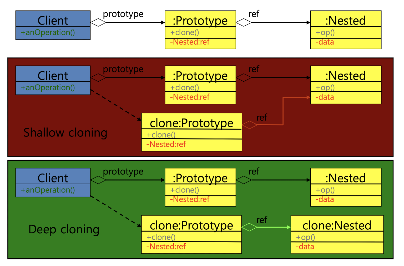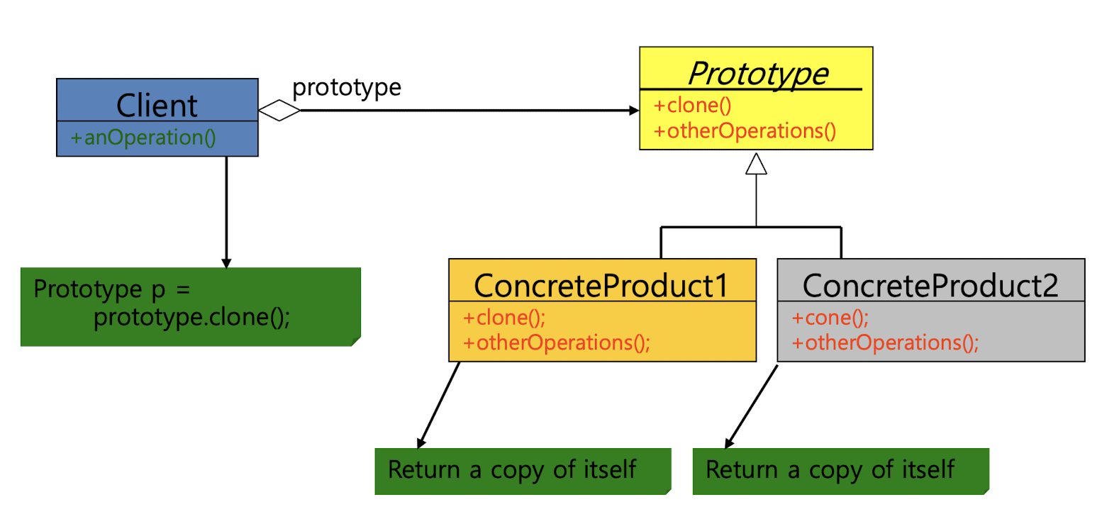 - ConcreteProduct : 자신을 복제할 수 있는 Object