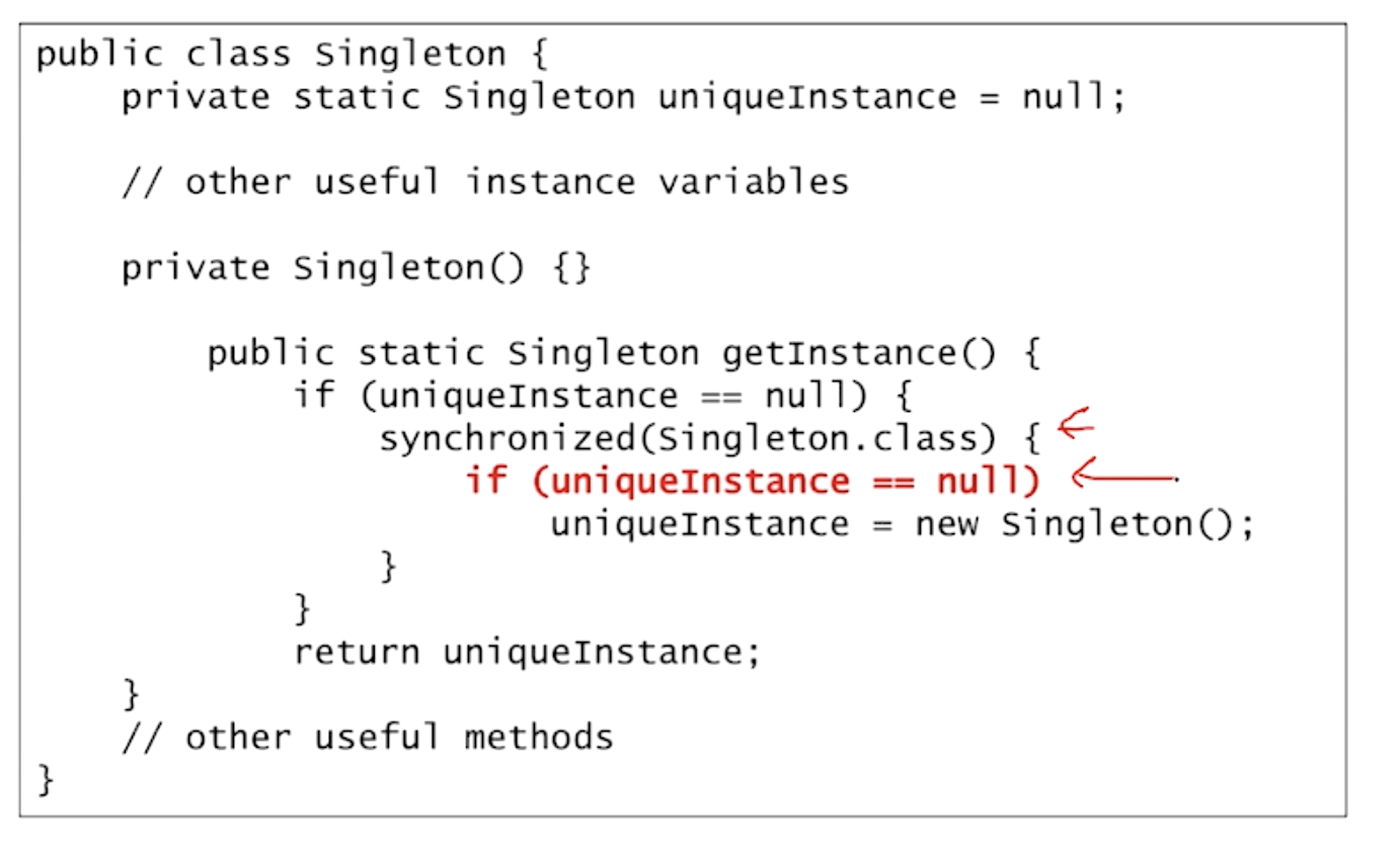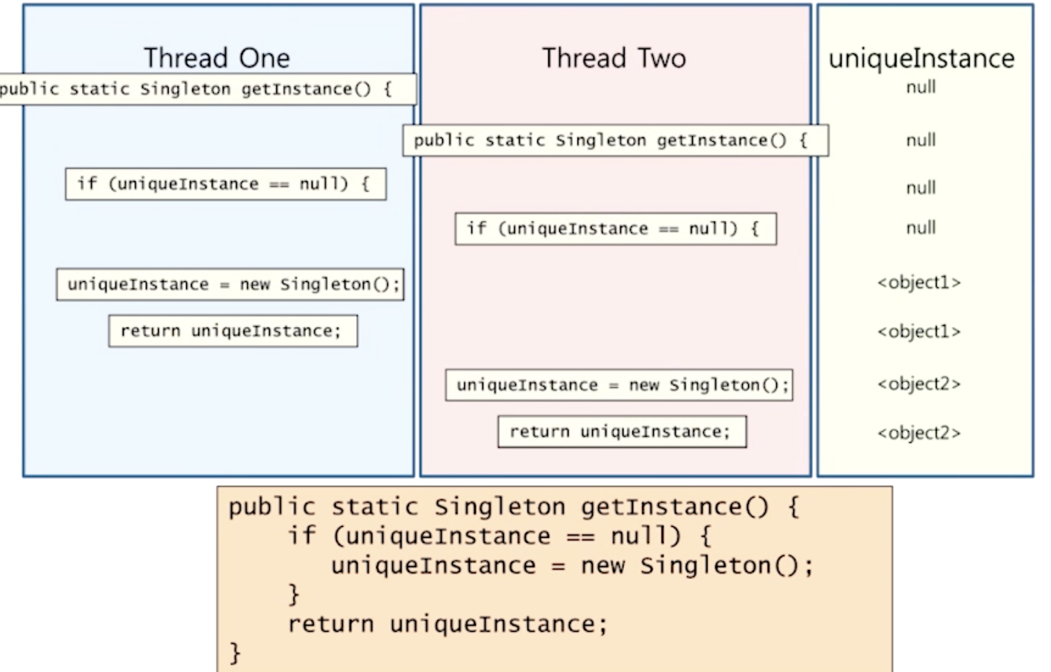 (두 thread가 getInstance()함수에서 if문에 위치하고 A thread가 생성하고 나가고 B thread가 if문에서 들어온 뒤에 null확인이 없으면 새로 인스턴스를 생성하게 된다)