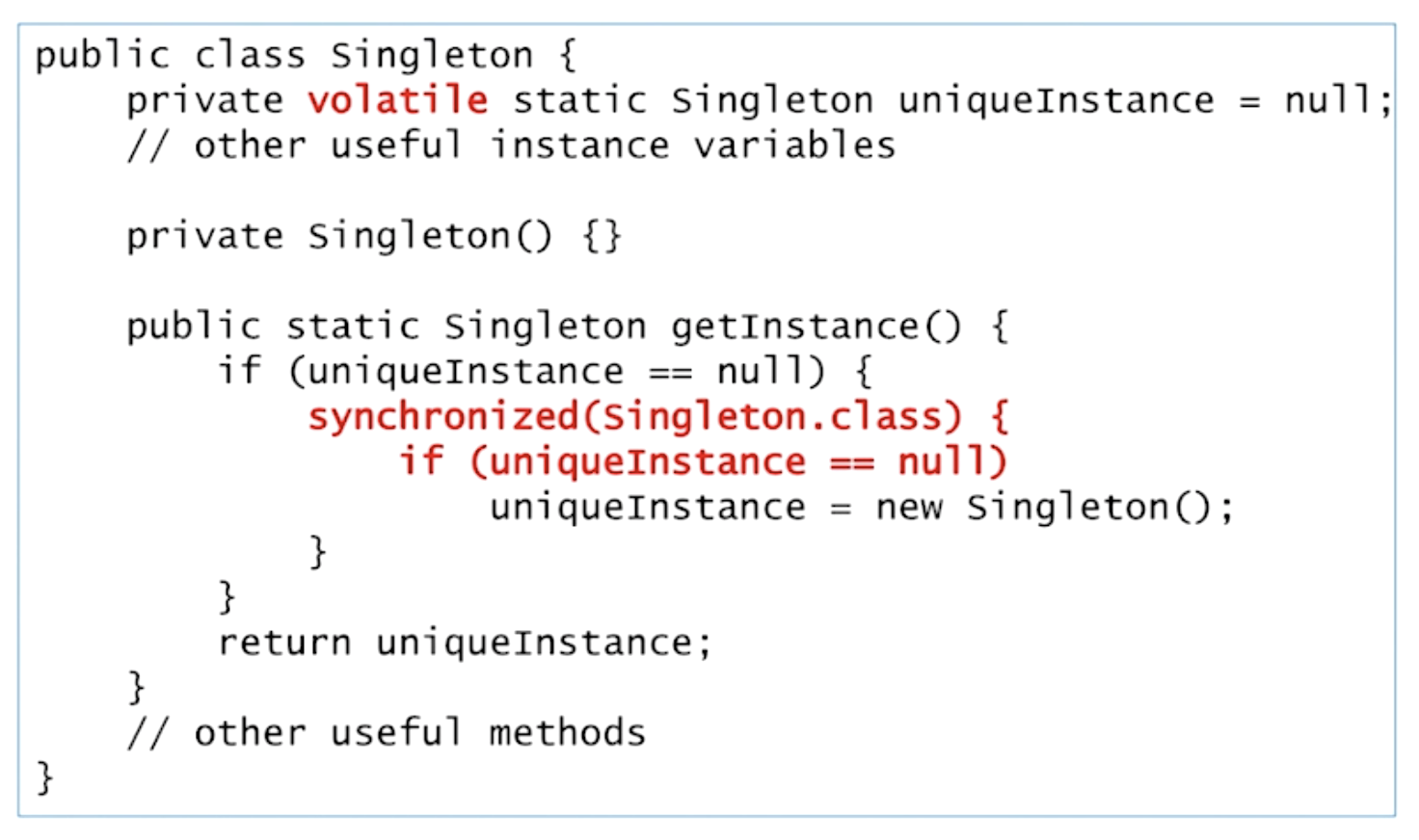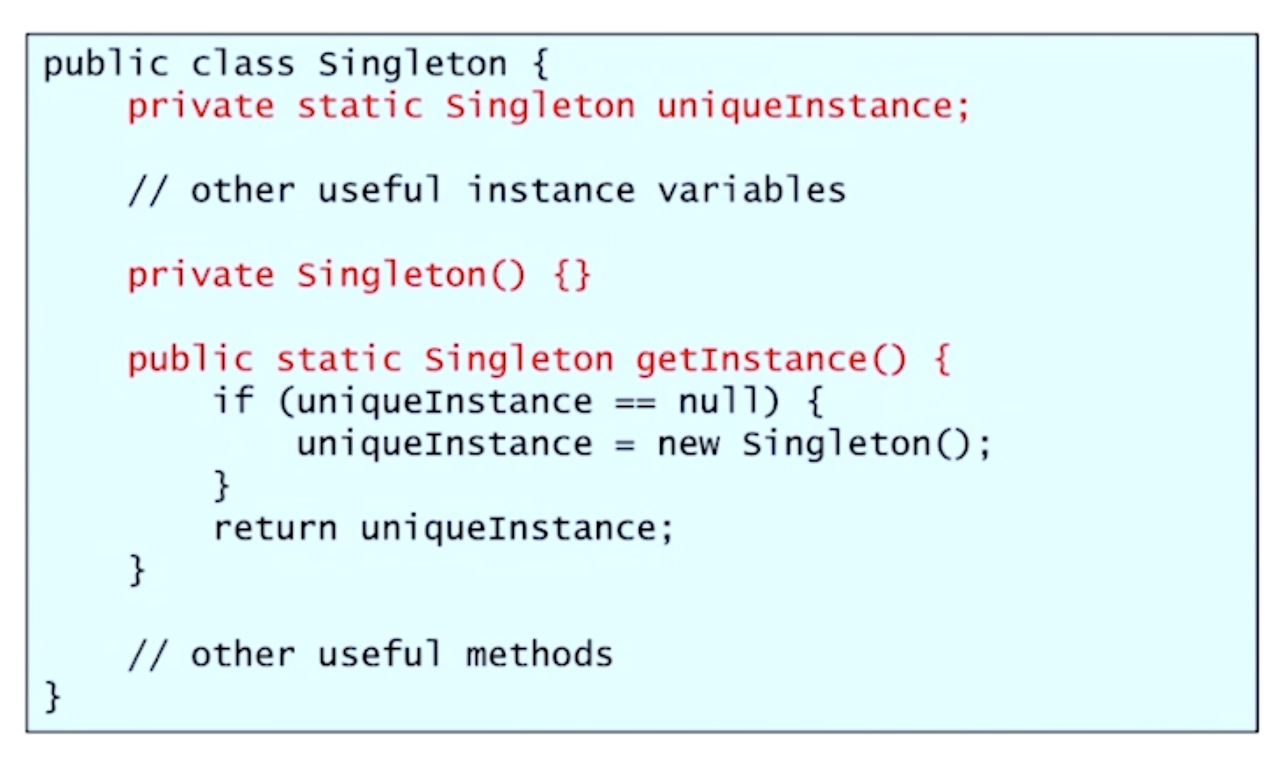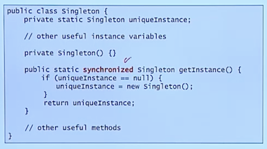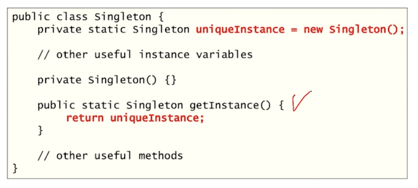 이 때, 밖에서 변경하지 못하도록 uniqueInstance는 private로 변경하고, static getInstance()에서 사용해야하기 때문에 static variable로 만들어준다.