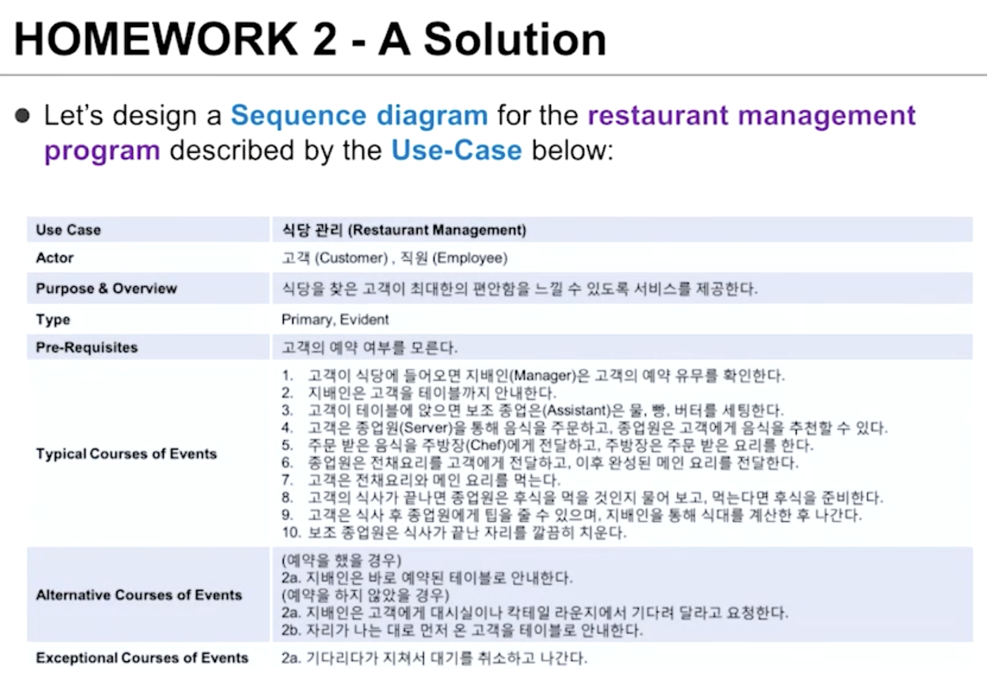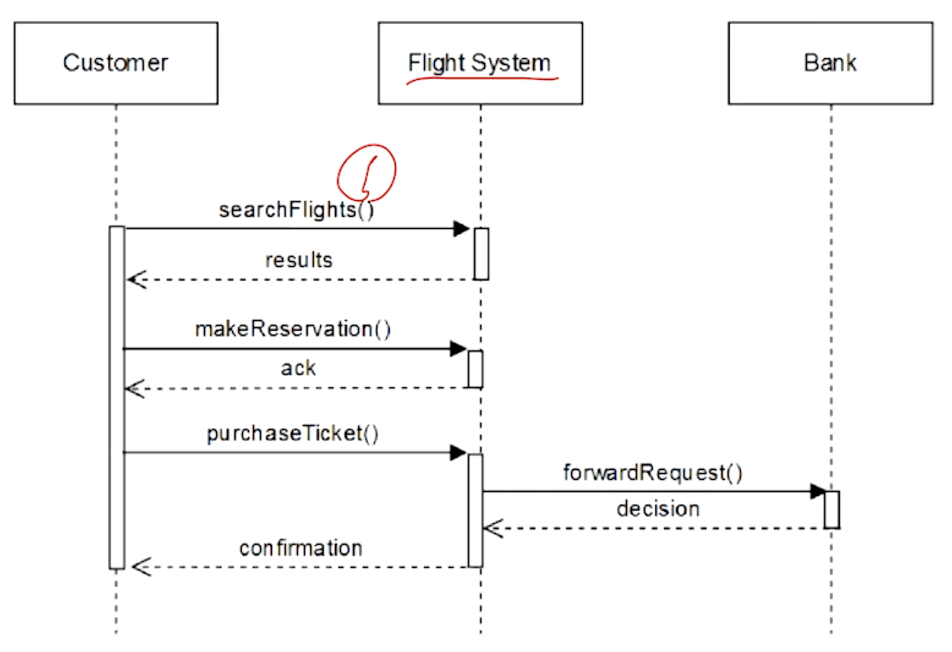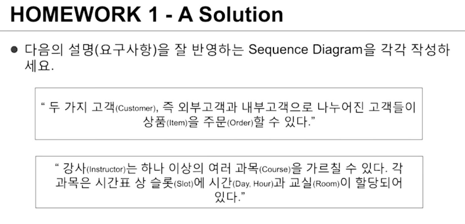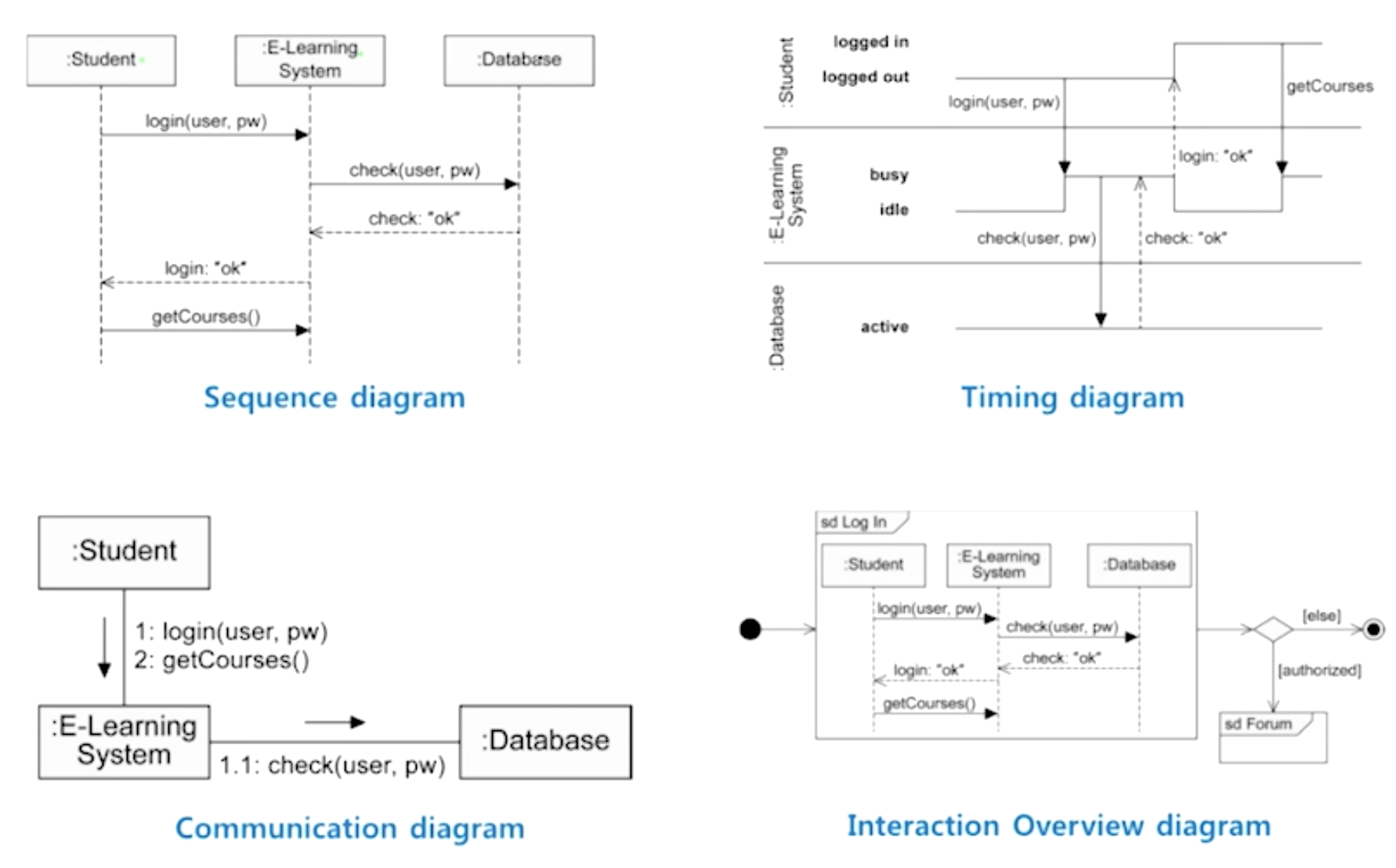 - Sequence diagram (주로 사용) : 시간 흐름에 따라 상호작용을 보여줌