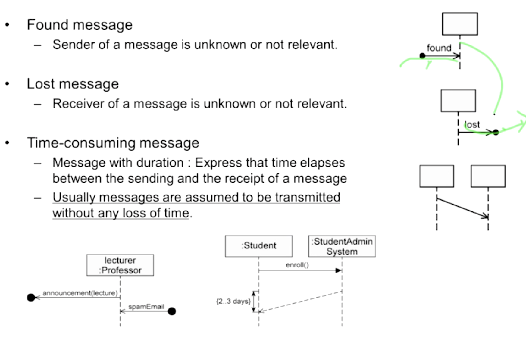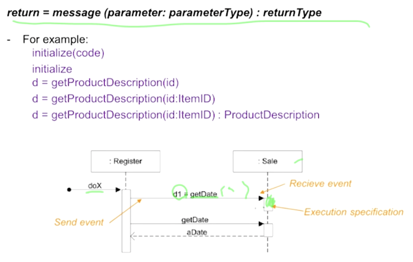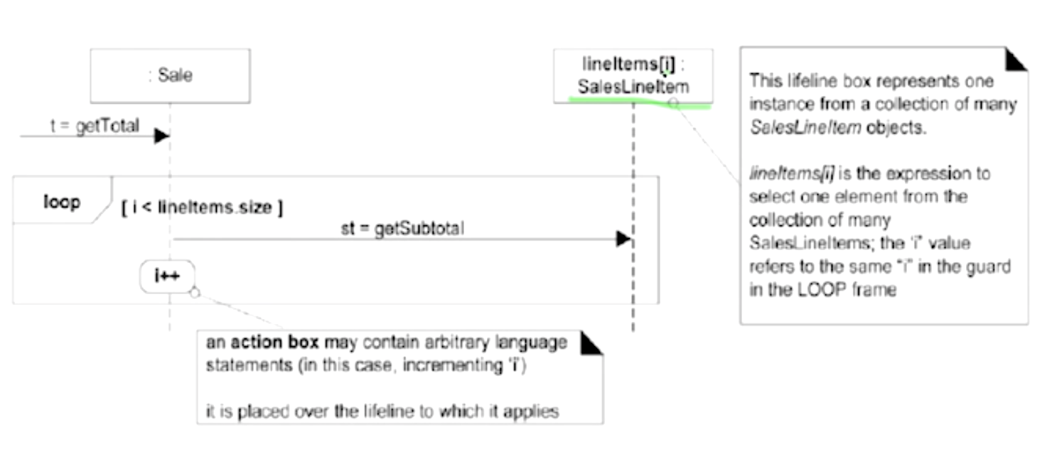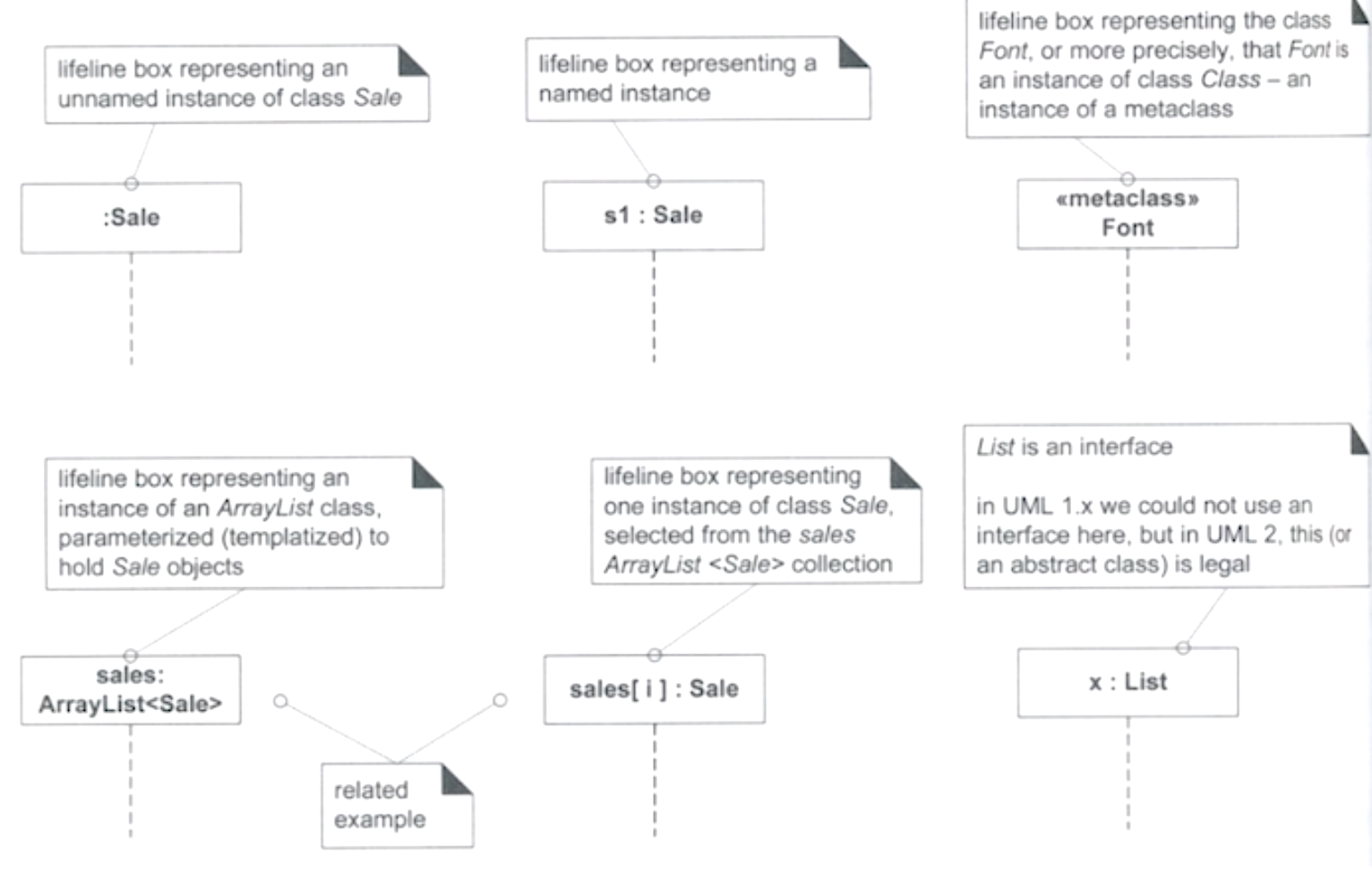 - Lifeline boxes and lifelines : object, class, subsystem, component 등