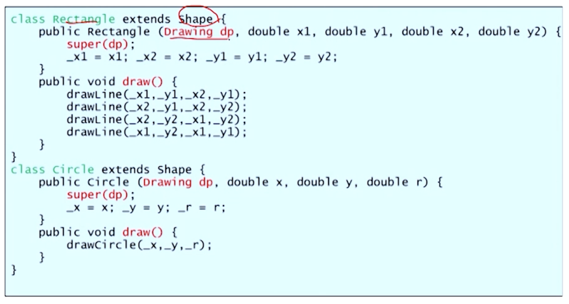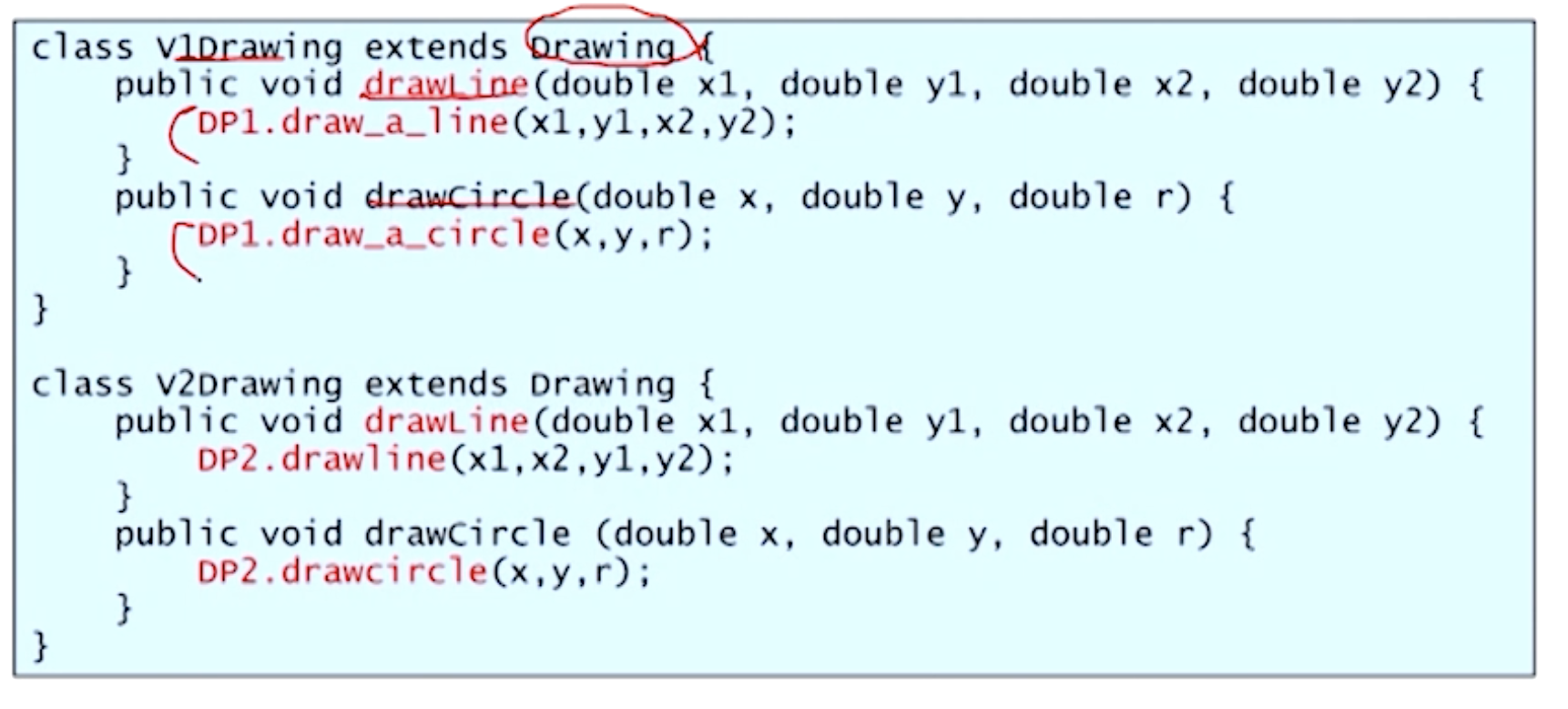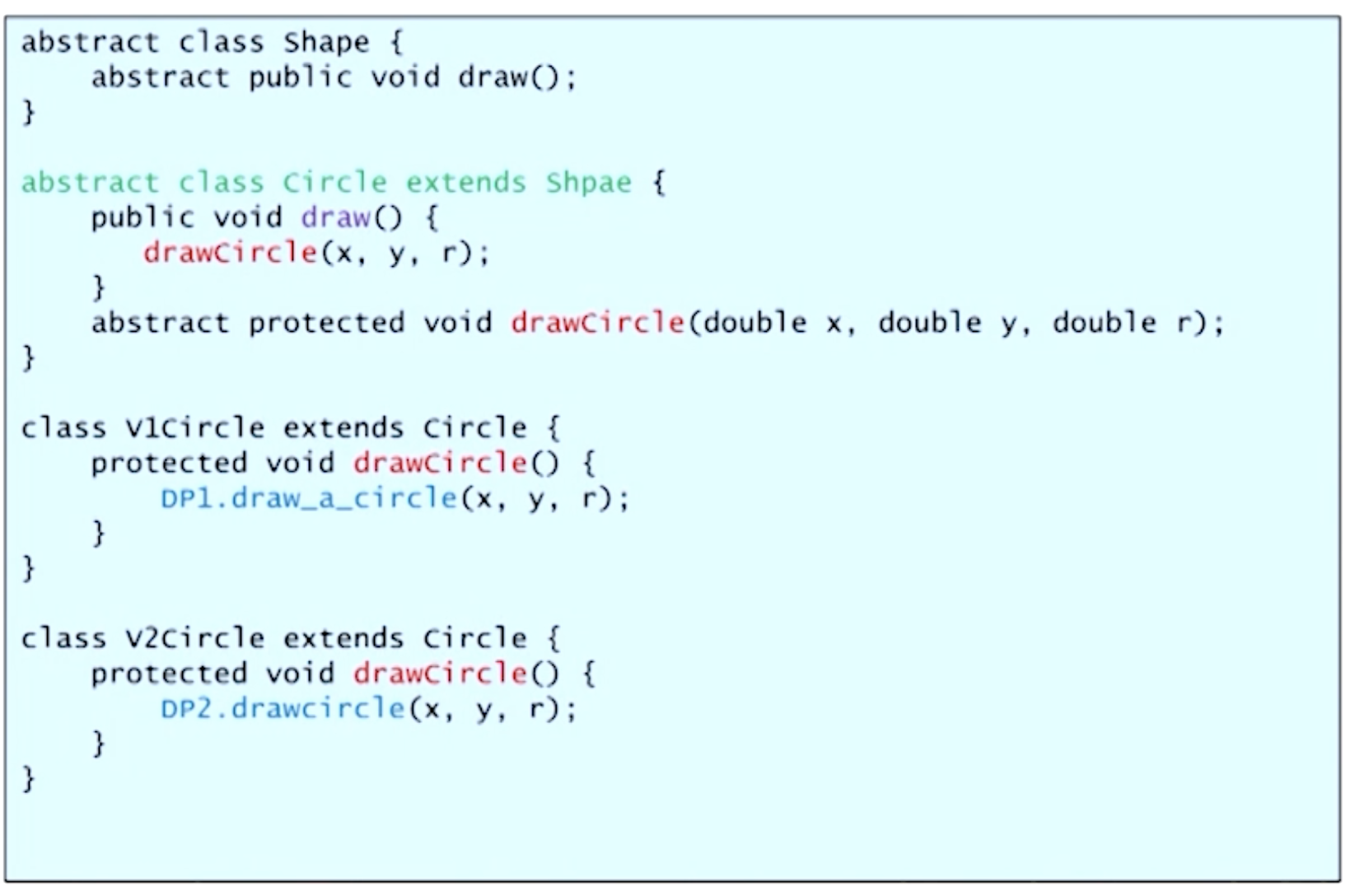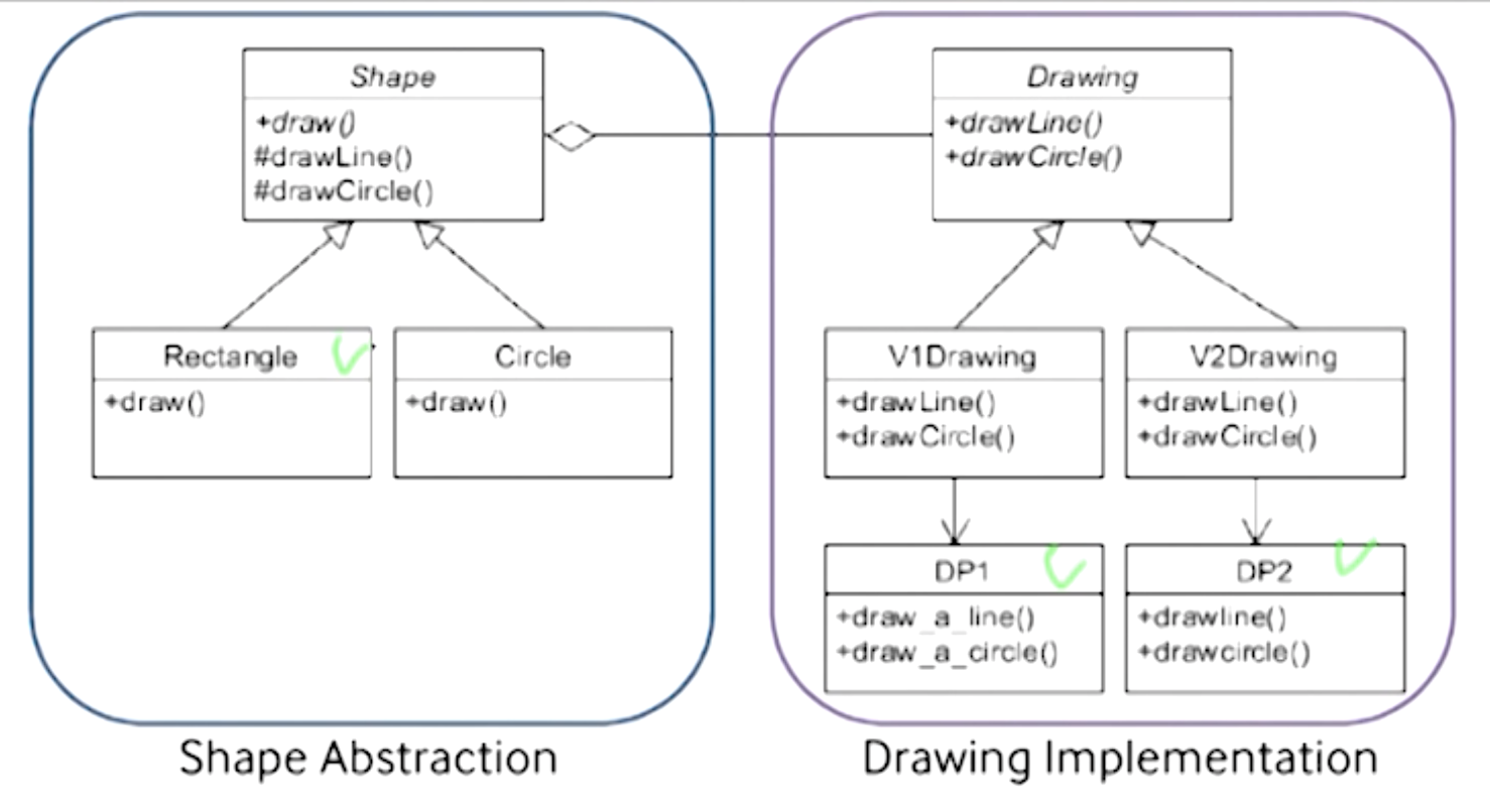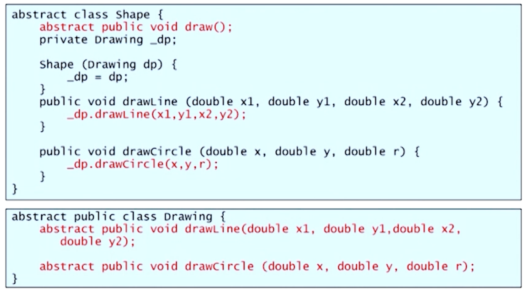 변하지 않는 Shape, Drawing은 abstract로 구현하고 변하는 모양, 라이브러리는 encapsulate 시킨다.