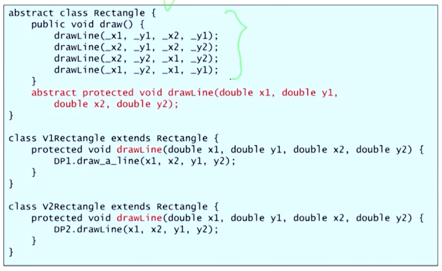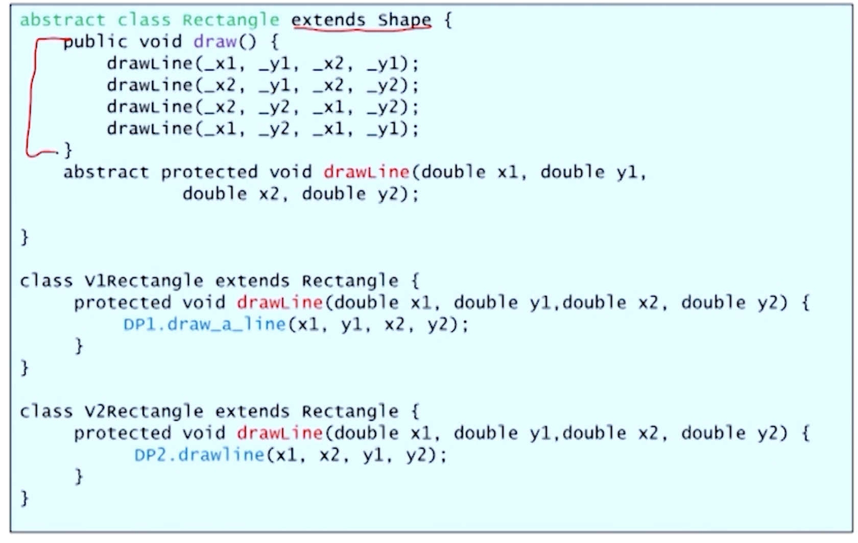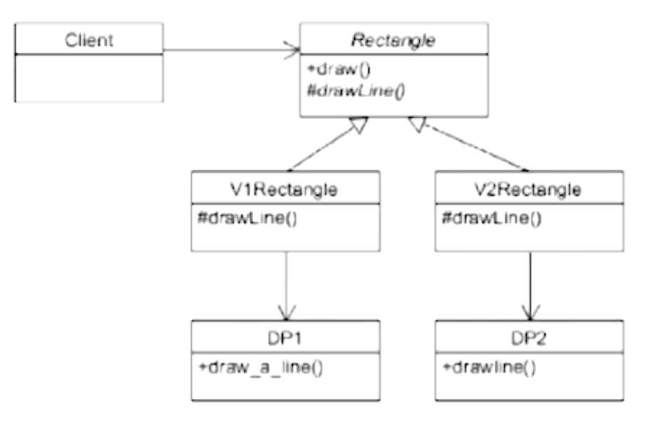 변하지 않는 Rectangle을 만들고(client가 접근하는 부분) 변하는 부분(V1, V2...)을 concrete class로 구현하여 encapsulate한다.
