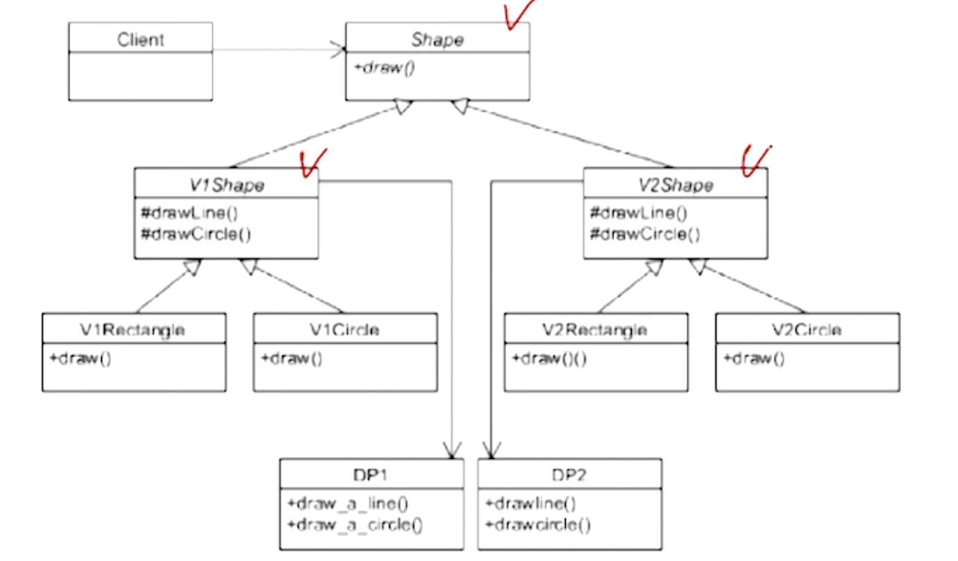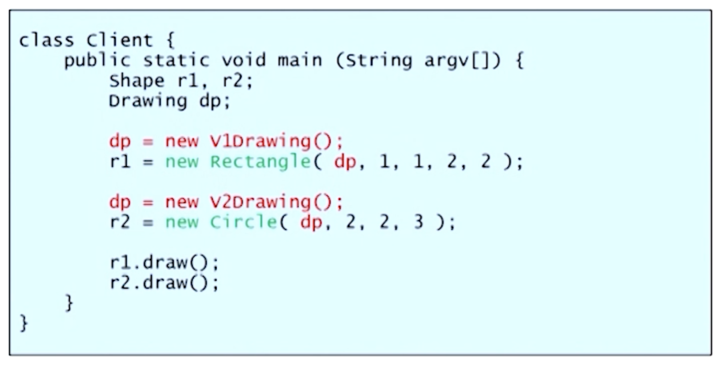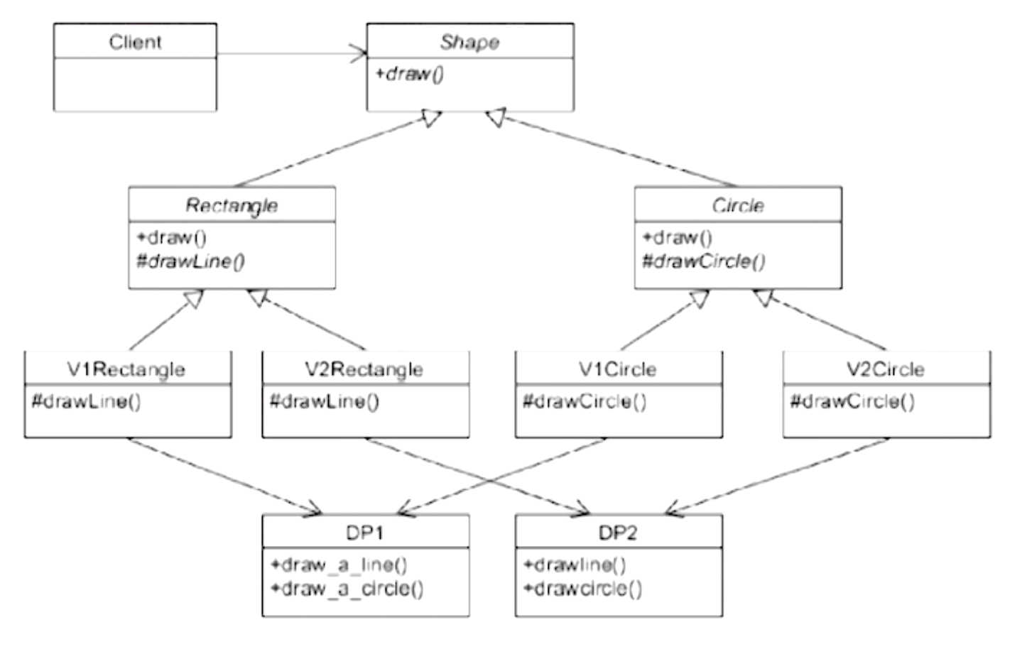 변하지 않는 Rectangle을 만들고(client가 접근하는 부분) 변하는 부분(V1, V2...)을 concrete class로 구현하여 encapsulate한다.