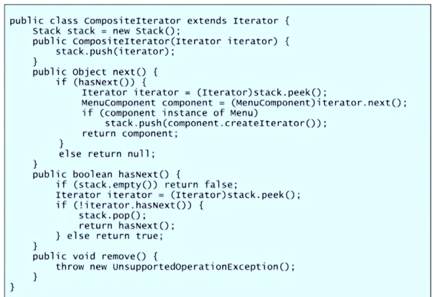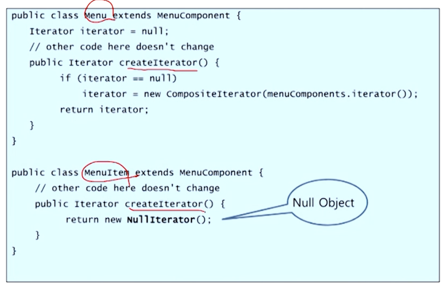 MenuItem은 자식이 없지만 일관성(모든 노드는 iterator를 가지고 있다)을 위해 NullIterator 만들어준다